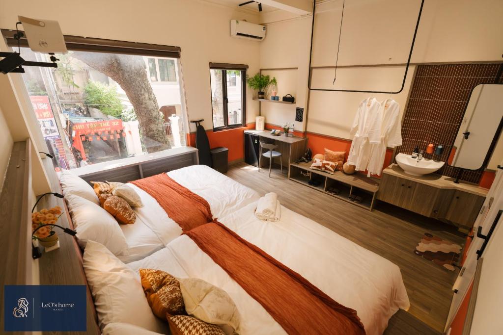 Phòng thì rộng thênh thang, kiểu rộng mà bạn có thể tập yoga giữa sàn mà không sợ đá trúng tường. Giường king-size to đùng, ga trắng tinh 100% cotton lạnh buốt, gối ôm êm đến mức sáng dậy cứ tưởng mình vừa ngủ ở resort Đà Lạt. Bàn làm việc dài 1m8 đặt ngay cạnh cửa sổ lớn nhìn ra phố cổ – ánh sáng tự nhiên chan hòa, wifi tốc độ 300Mb đối xứng, đủ để bạn họp Zoom với khách Tây mà không cần tắt camera vì ngại nền.