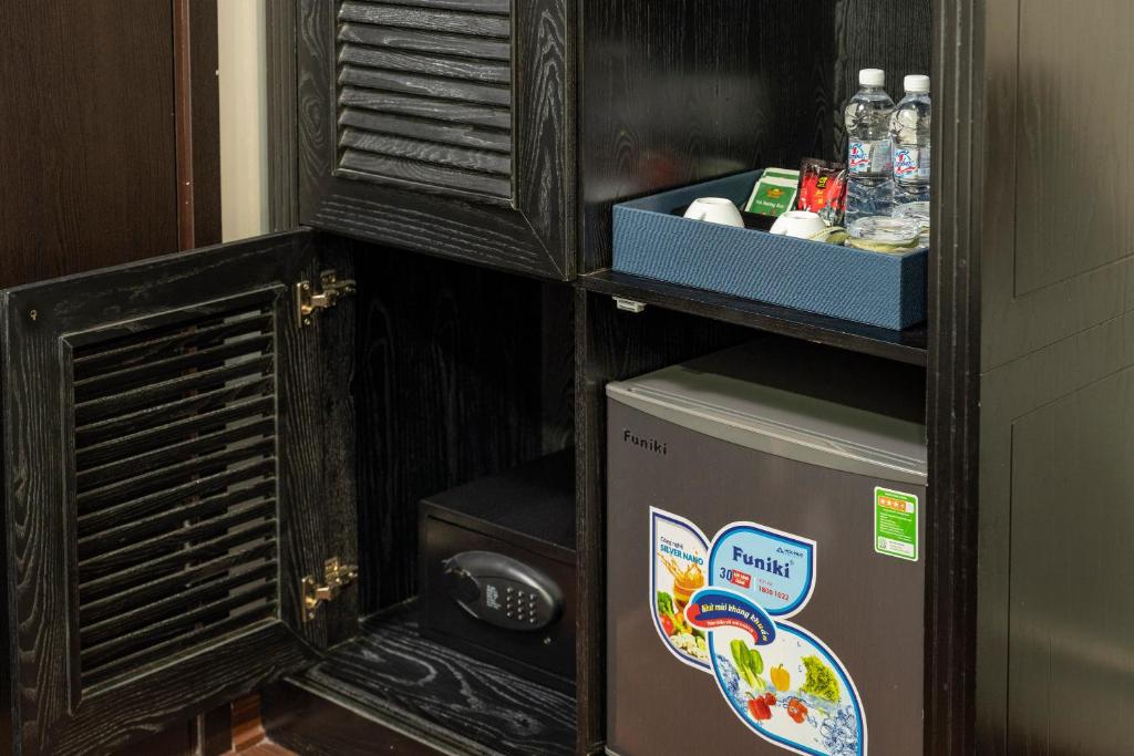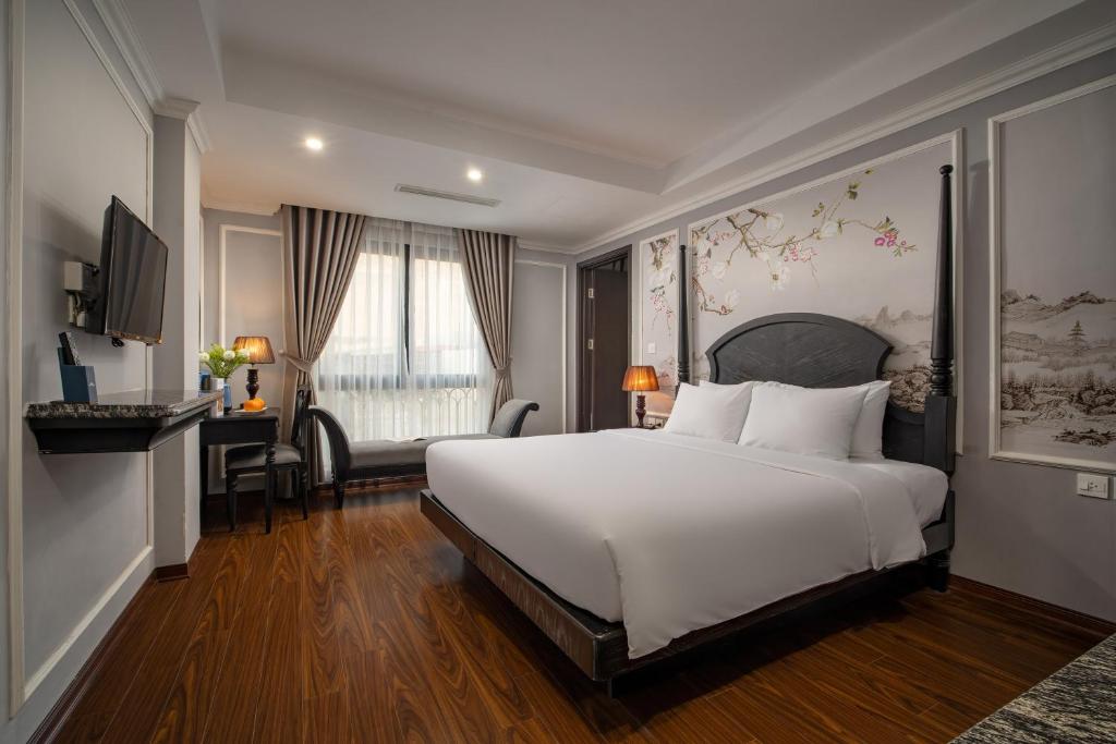 Phòng được trang bị đầy đủ điều hòa không khí, tủ lạnh mini, ấm đun nước, bàn làm việc tinh gọn, TV màn hình phẳng và két an toàn riêng biệt. Phòng tắm riêng khép kín đi kèm vòi sen hiện đại, vòi xịt/chậu rửa vệ sinh, cùng đồ dùng cá nhân cao cấp. Mỗi buổi sáng thức dậy, du khách có thể đắm mình trong không gian yên bình, nhìn ra nhịp sống phố phường Hà Nội đang dần tỉnh giấc.