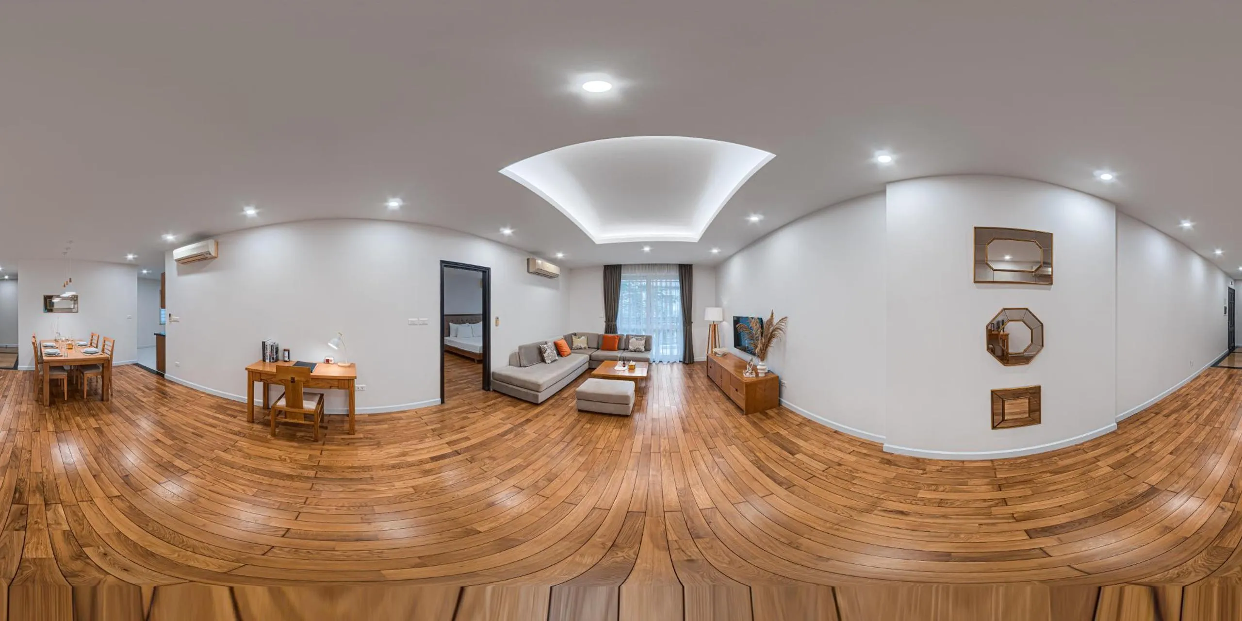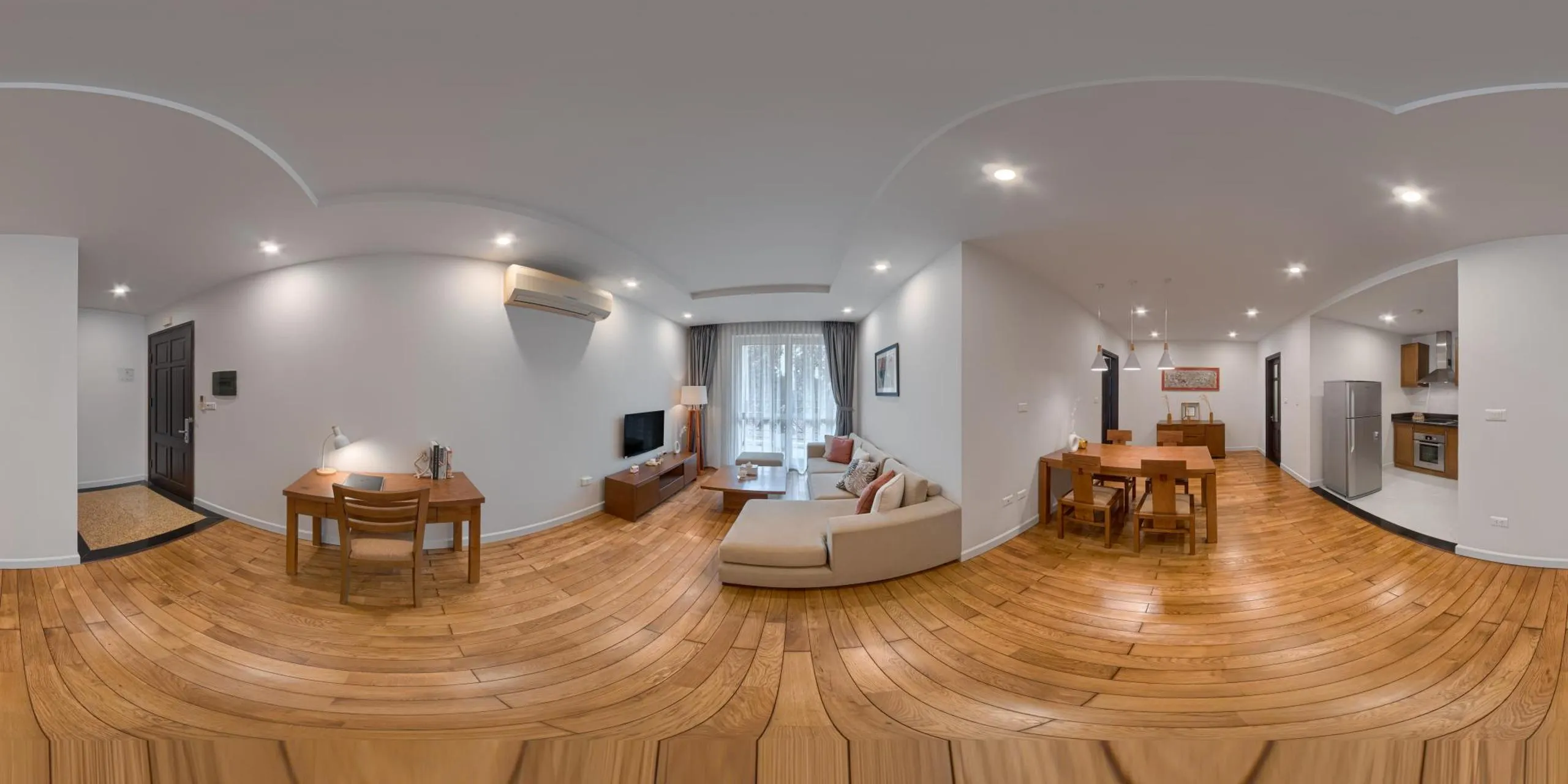 Phòng khách rộng rãi với sofa êm ái, TV LCD và khu vực ăn uống tiện nghi.
