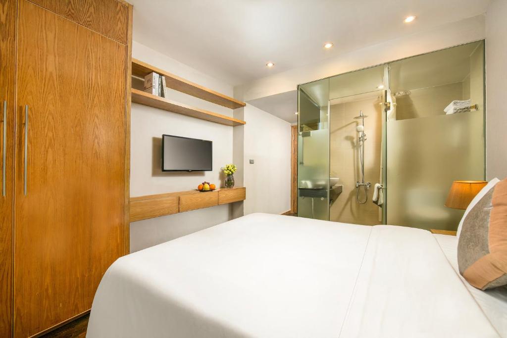 Đặc biệt, phòng tắm riêng trong mỗi phòng được trang bị đầy đủ tiện nghi như vòi sen, máy sấy tóc, dép đi trong phòng và đồ vệ sinh cá nhân cao cấp miễn phí. Một số phòng còn có tầm nhìn bao quát ra toàn cảnh thành phố Hà Nội, mang đến cho du khách trải nghiệm thư giãn tuyệt vời sau một ngày dài khám phá.