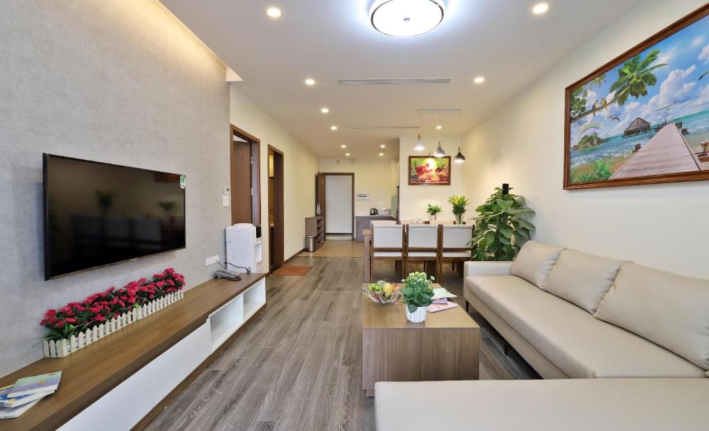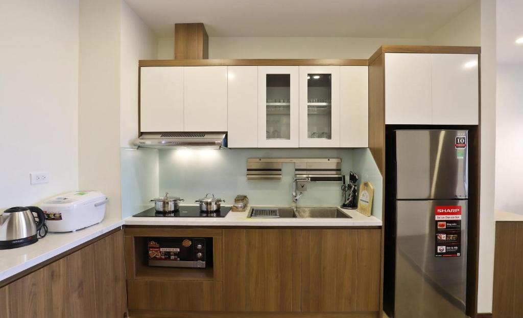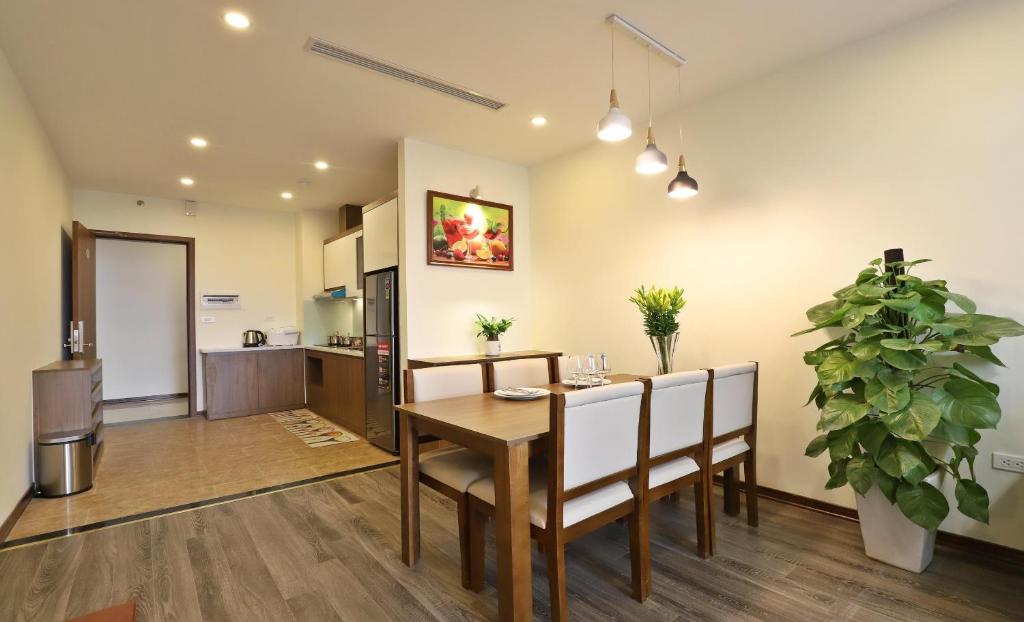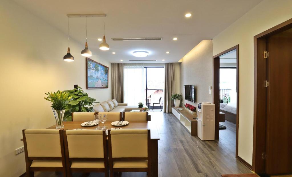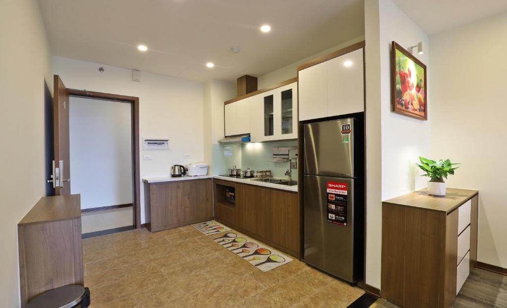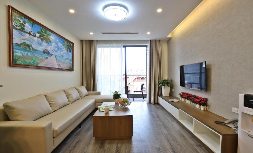 Mỗi căn hộ đều có ban công riêng, nơi du khách có thể thưởng thức tầm nhìn toàn cảnh thành phố, cảm nhận không khí trong lành và nhịp sống năng động của Hà Nội. Không gian phòng được bố trí tinh tế với khu vực ghế ngồi thoải mái, TV màn hình phẳng, bếp đầy đủ tiện nghi với tủ lạnh và lò vi sóng, mang đến sự thuận tiện tối đa cho việc nấu nướng và thư giãn tại chỗ. Phòng tắm riêng hiện đại đi kèm vòi sen và đồ vệ sinh cá nhân miễn phí, giúp trải nghiệm lưu trú thêm phần tiện nghi và thư giãn.