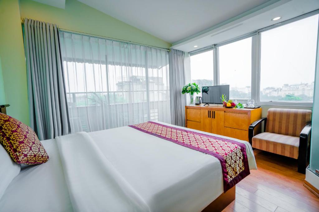 - Lake View Deluxe: xanh ngọc – trắng sữa, giường king 2m6 hướng thẳng hồ Gươm