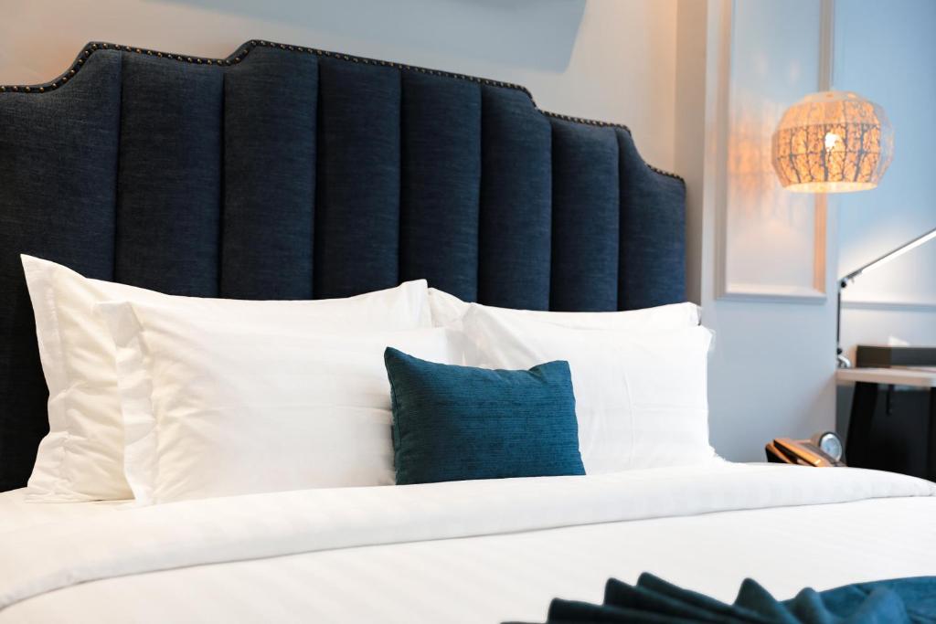 Phòng thì đẹp đến mức bạn sẽ muốn chụp ảnh đăng story ngay từ giây đầu tiên. Có bốn loại: Classic nhìn ra ngõ nhỏ, Deluxe có ban công lớn nhìn thẳng Ô Quan Chưởng, Premium view Hồ Gươm lấp lánh, và Fiesta Suite chiếm nguyên tầng trên cùng với bồn tắm kính nhìn ra cả phố cổ. Giường to đến mức lăn hai vòng chưa chạm mép, ga cotton 800 sợi mát lạnh, gối lông vũ êm như ngủ trên mây. Điều hòa Daikin chạy lặng như mèo con, TV 55 inch có Netflix sẵn, két sắt to đủ nhét cả cái MacBook 16 inch, tủ lạnh mini lúc nào cũng có hai chai nước suối và một hộp chocolate đón khách.