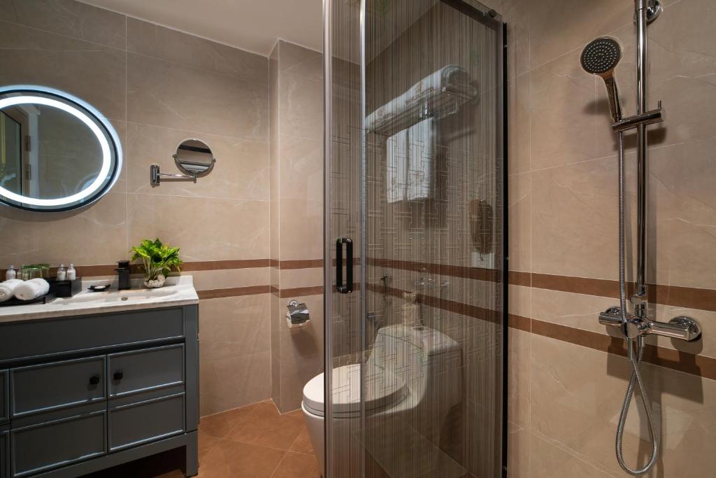 Phòng tắm là nơi khiến chị em “quay xe” ngay lập tức: vòi sen mưa nhiệt đới, bồn cầu thông minh tự mở nắp, vòi xịt nước ấm, bộ amenities mùi hoa sứ của Accor, máy sấy tóc Dyson, khăn tắm dày đến mức muốn gói về nhà. Đặc biệt, một số phòng có bồn tắm nằm ngay cạnh cửa sổ – ngâm mình trong bọt xà phòng, nhìn xuống thấy Ô Quan Chưởng sáng đèn là cảm giác chỉ có thể mô tả bằng một từ: đỉnh.