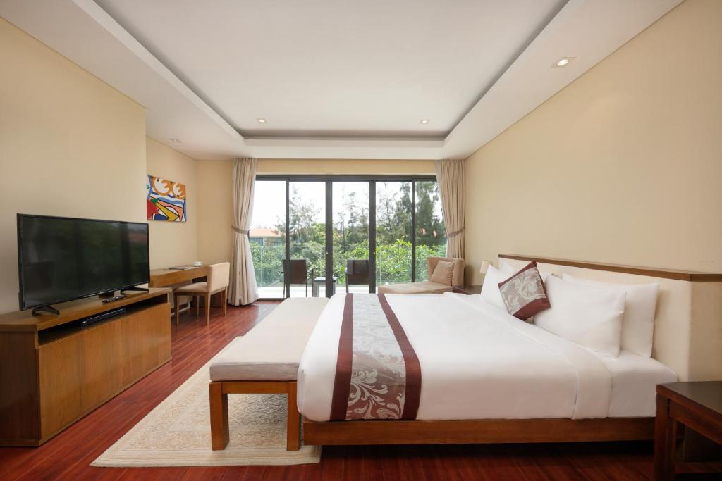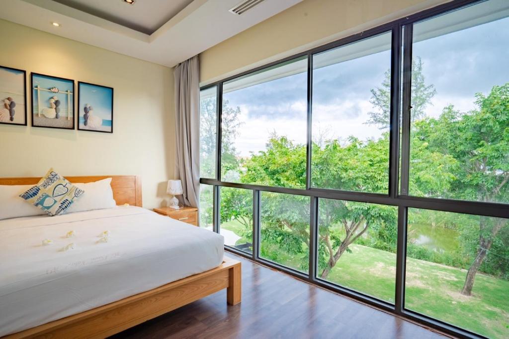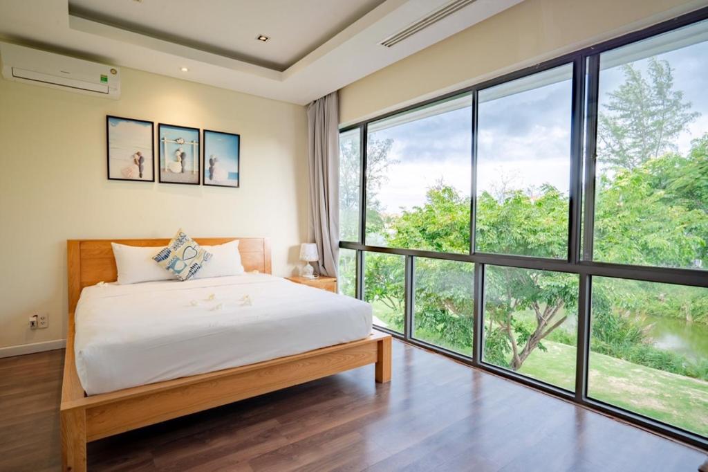 Bước chân vào không gian biệt thự, sự chỉn chu hiện hữu trong từng chi tiết. Mỗi căn đều sở hữu ban công thoáng đãng hướng hồ, nơi bạn có thể nhâm nhi ly cà phê sáng hoặc thả mình vào ánh hoàng hôn tím biếc. Nội thất được trang bị đầy đủ – từ TV màn hình phẳng, ghế sofa êm ái, bếp tiện nghi với tủ lạnh và lò nướng, đến phòng tắm riêng lát gạch thanh lịch với vòi sen hiện đại và bộ sản phẩm chăm sóc cá nhân cao cấp. Nếu cần, khăn tắm và ga giường sẽ được phục vụ tận nơi với mức phí nhỏ, mang lại sự tiện lợi tối đa.