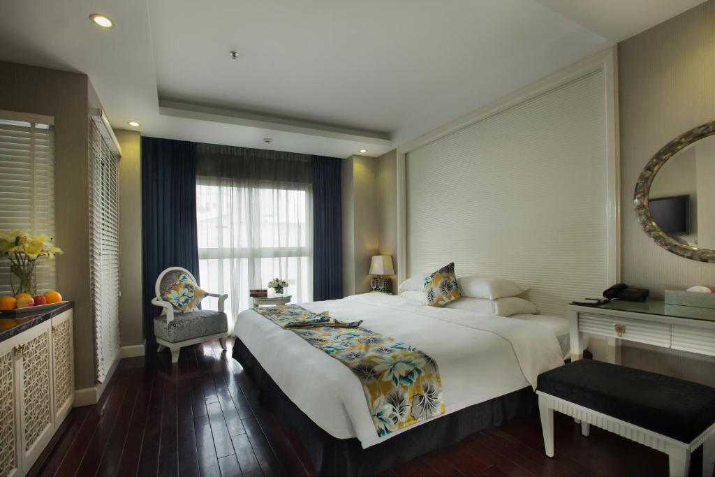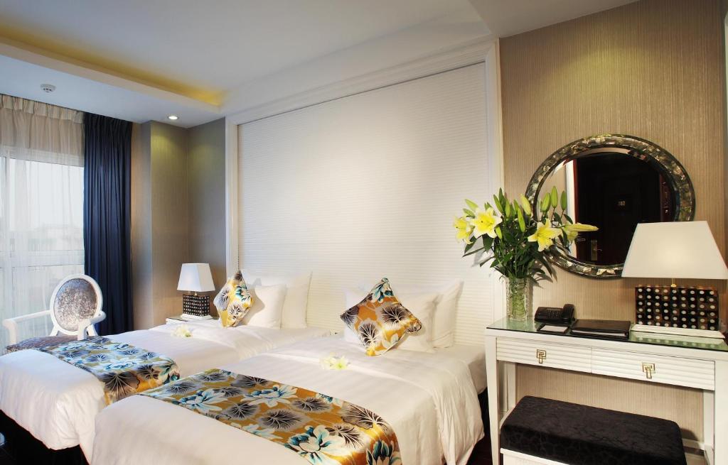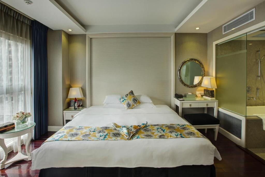 - Golden Silk Signature: tầng cao nhất, giường tròn phủ khăn lụa thêu tay, chai champagne rosé lạnh sẵn, ban công nhìn thẳng tháp Rùa