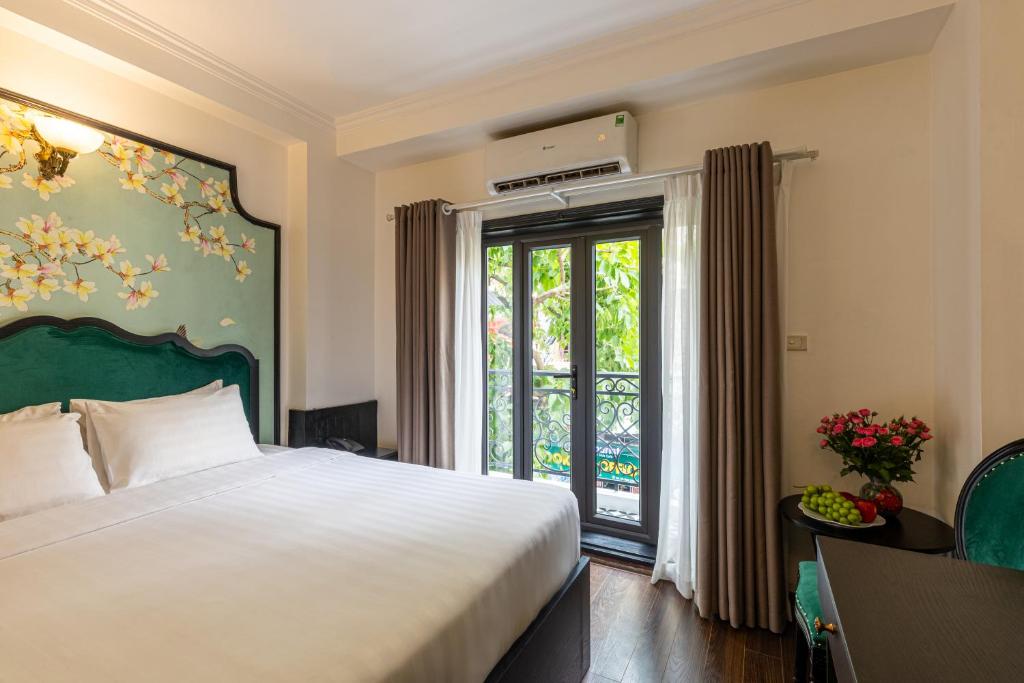 • House Classic: xanh lá mạ – trắng sữa, giường queen 1m8, cửa sổ mở ra thấy ngay cầu Thê Húc đỏ