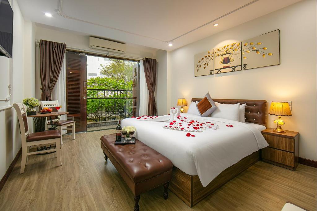 - Tunger Deluxe Balcony: sân hiên thật 8m² lát gỗ, bàn rượu + ghế da, tối ngồi nhấm nháp vang nhìn hồ Gươm