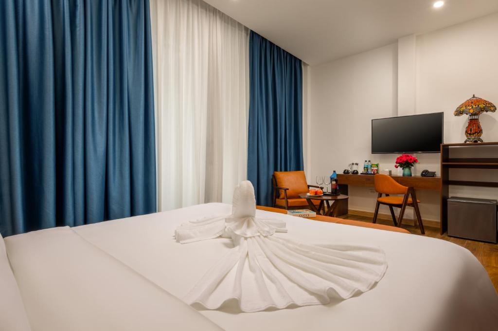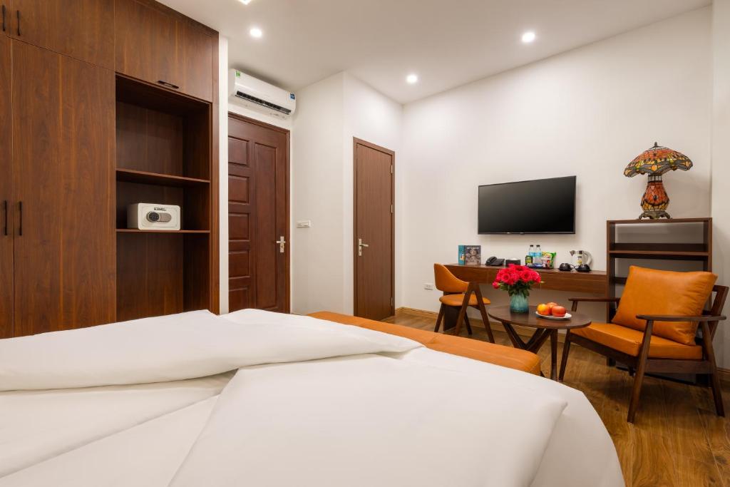 Cửa phòng hé mở, điều hòa vuốt ve không khí oi nồng, bàn làm việc marble vững chãi biến thành trụ sở chỉ huy, ấm đun nước sôi sùng sục cho espresso Ý, tủ lạnh im lìm giữ lạnh prosecco, minibar đầy ắp bất ngờ, két sắt kín đáo nuốt trọn châu báu, TV phẳng khổng lồ phát sóng thế giới, phòng tắm riêng tư với vòi xịt thông minh, ga giường linen Ireland êm ái, khăn tắm bamboo mềm mại như lụa. Mỗi phòng là một kiệt tác, nơi từng đường nét đều thì thầm câu chuyện Ý – Việt.