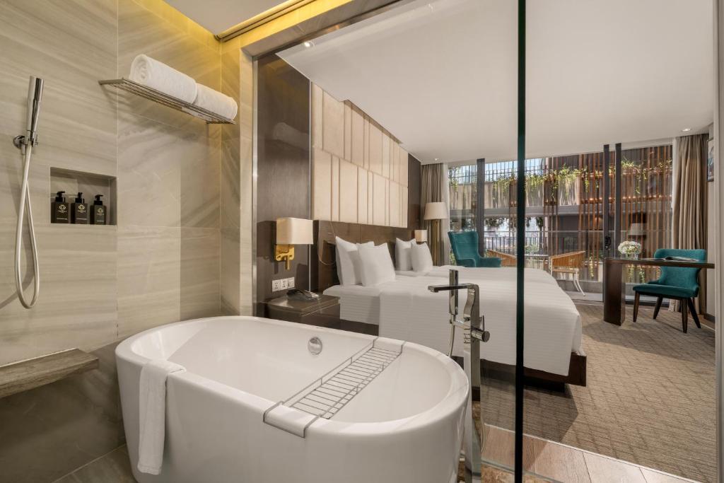 Điểm nổi bật chính là một số phòng có ban công riêng, mở ra khung cảnh thành phố sống động về đêm. Phòng tắm riêng đi kèm vòi sen, máy sấy tóc và đồ vệ sinh cá nhân miễn phí, tạo sự thuận tiện tối đa cho khách. Dù bạn đi công tác hay nghỉ dưỡng, mỗi căn phòng đều mang lại cảm giác như ngôi nhà thứ hai.