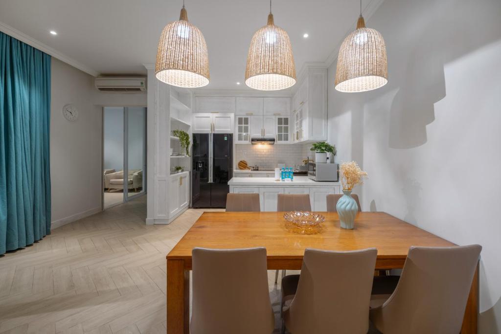Một trong những điểm cộng lớn khiến nhiều du khách yêu thích chính là bếp hiện đại, đầy đủ tiện nghi gồm tủ lạnh, lò nướng, lò vi sóng, bếp điện, máy nướng bánh mì và ấm đun nước. Không gian bếp rộng rãi cho phép bạn tự tay chuẩn bị những bữa ăn ấm cúng cho gia đình, mang lại trải nghiệm như đang ở chính ngôi nhà của mình.