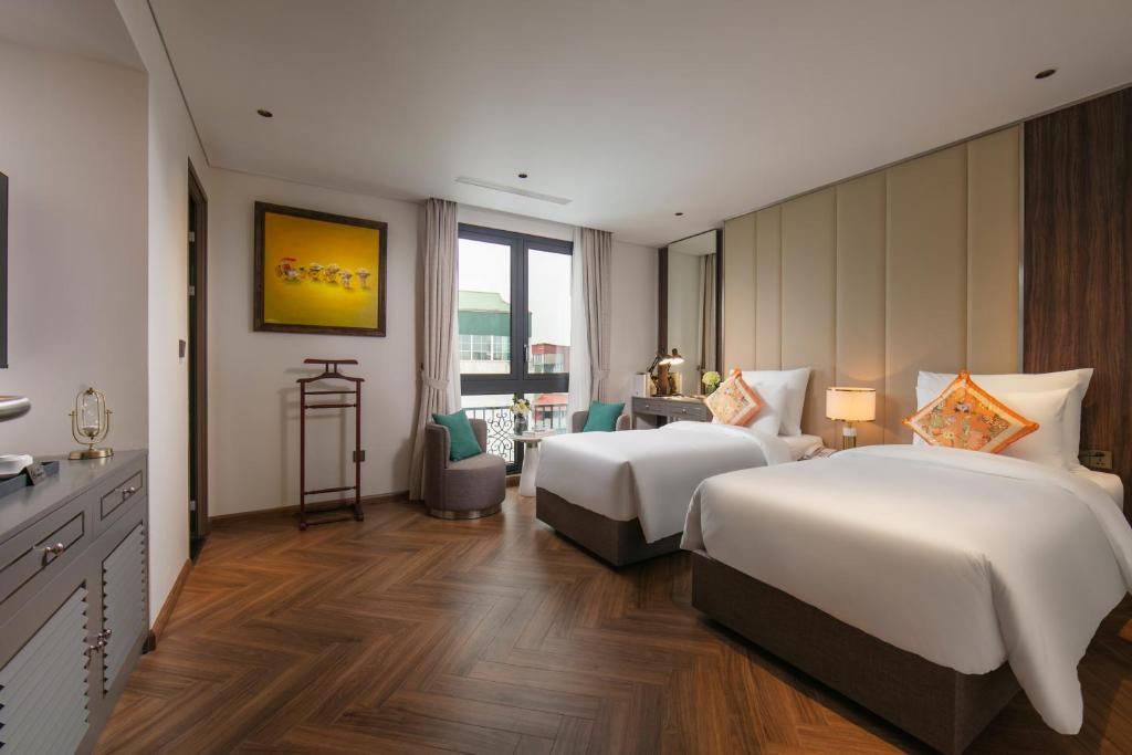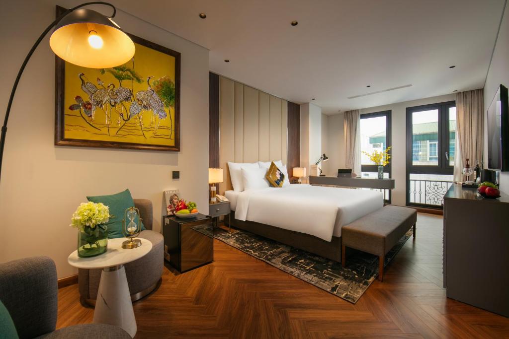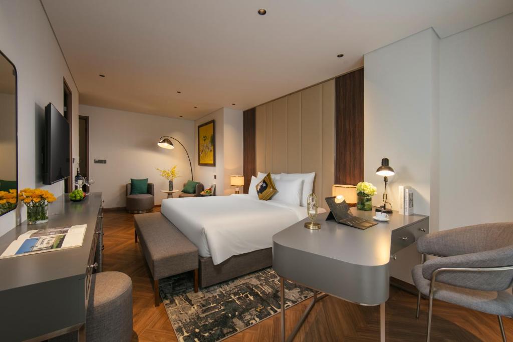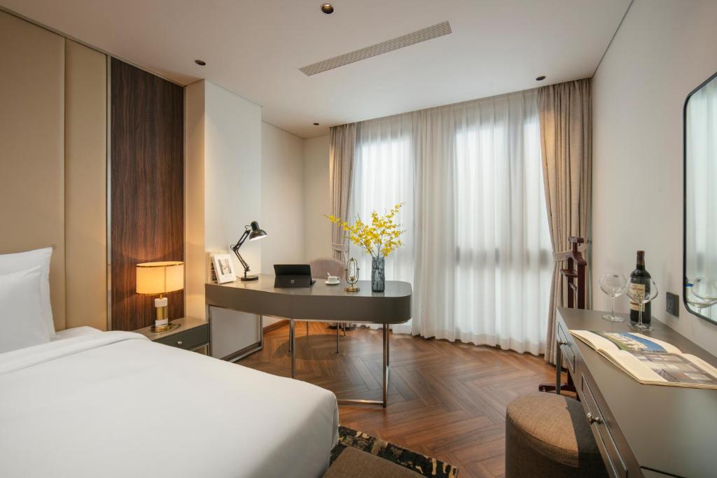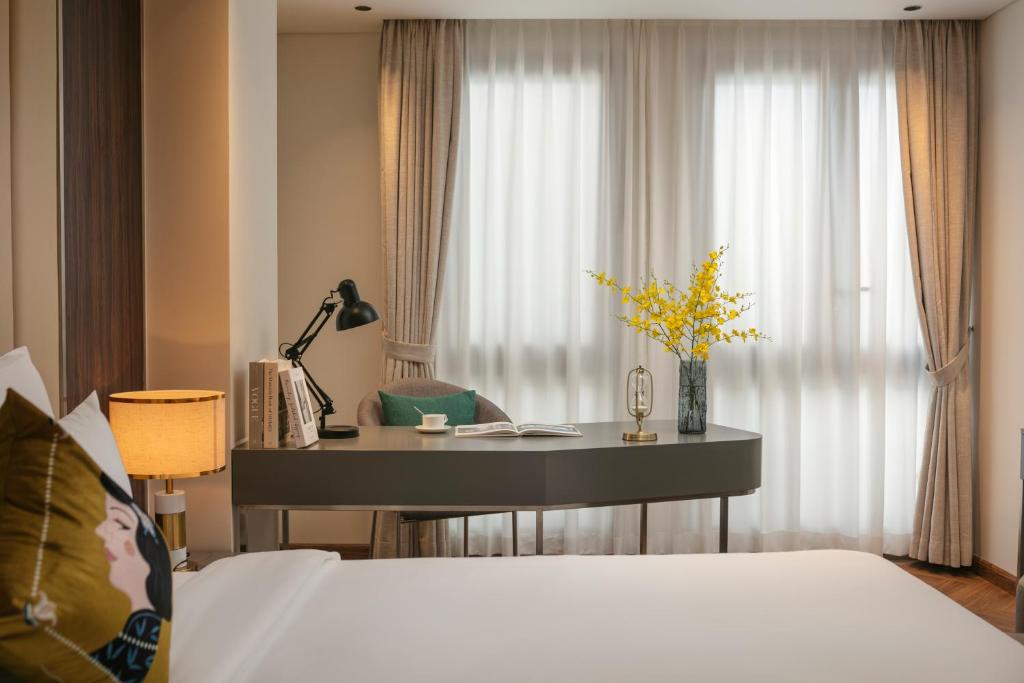 Tủ quần áo rộng lớn nuốt chửng hành lý, ấm đun nước chờ pha trà thảo mộc lúc nửa khuya. Một số phòng khoe ban công lộng gió, nơi bạn nhấp raclette tan chảy ngắm dòng người phố cổ nhảy múa; những căn khác mở cửa kính ôm trọn view thành phố lung linh – không phải cái nhìn mơ hồ, mà là cái vuốt ve từ những mái ngói cong soi bóng hồ Gươm. Ánh sáng dịu nhẹ từ đèn pha lê Geneva, rèm linen trắng muốt – thức dậy với tiếng chuông đồng hồ cổ, kéo rèm đón nắng heo may. Đây là nơi phòng không gây dị ứng khắc cốt ghi tâm, từ những buổi hít thở tinh khiết trên ghế ngồi đến giấc ngủ không vướng bận, thiên đường cho du khách hen suyễn hoặc kẻ sành điệu tìm bình yên.