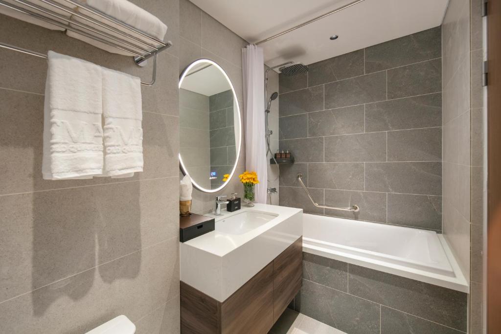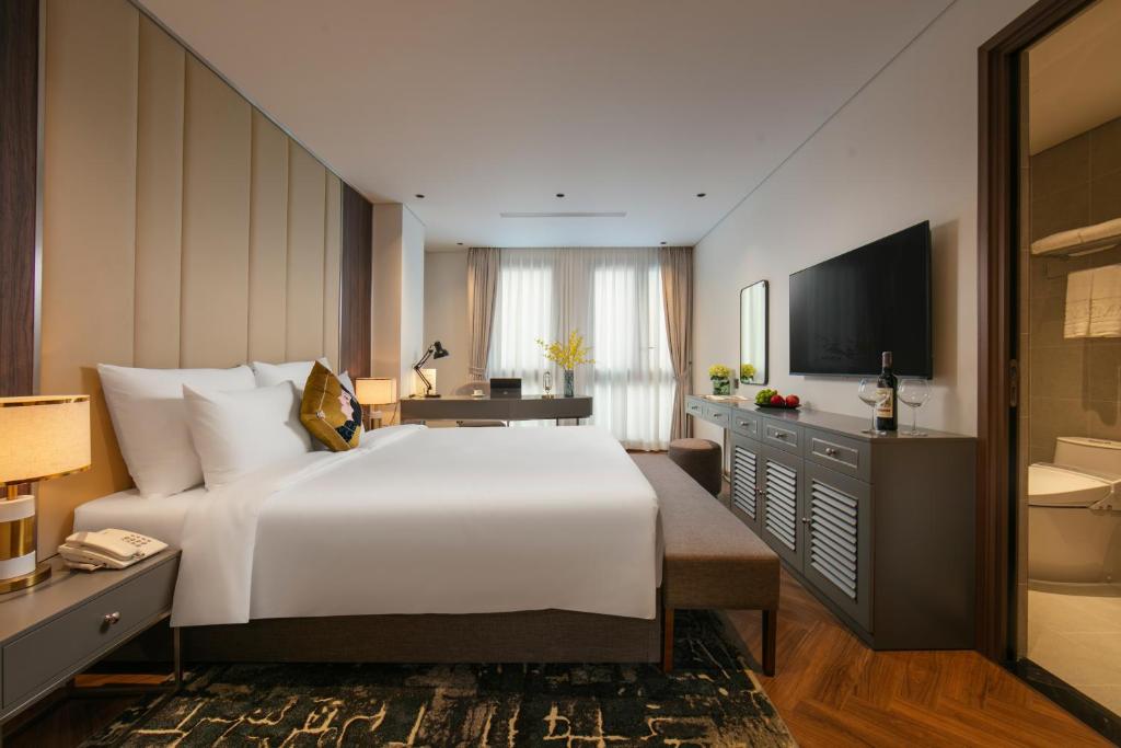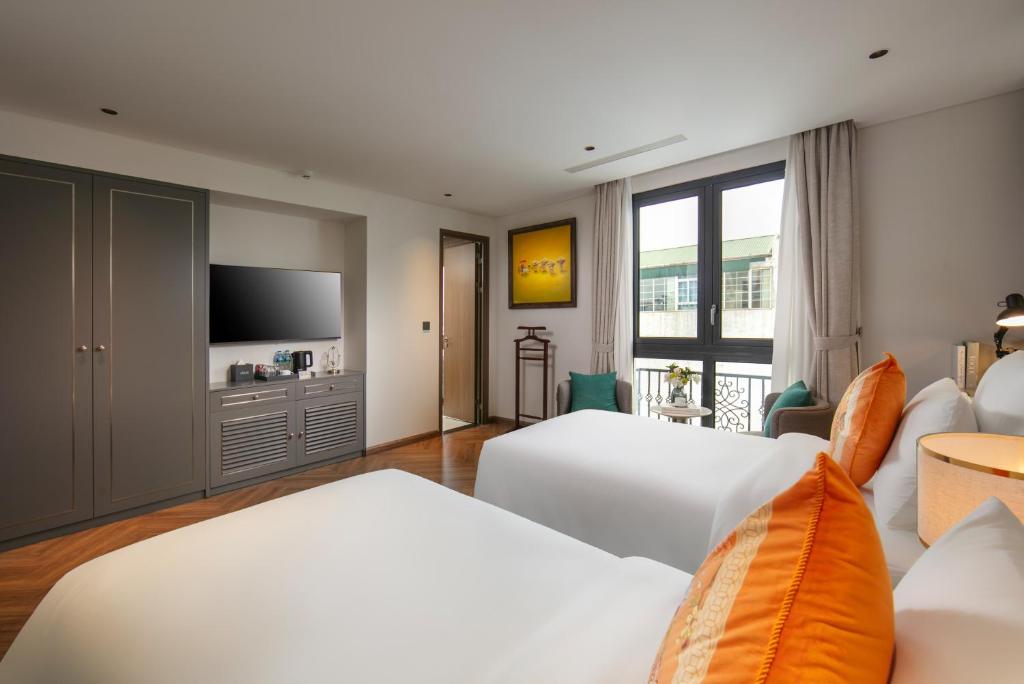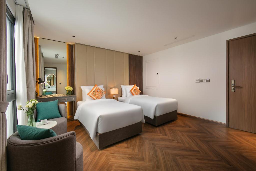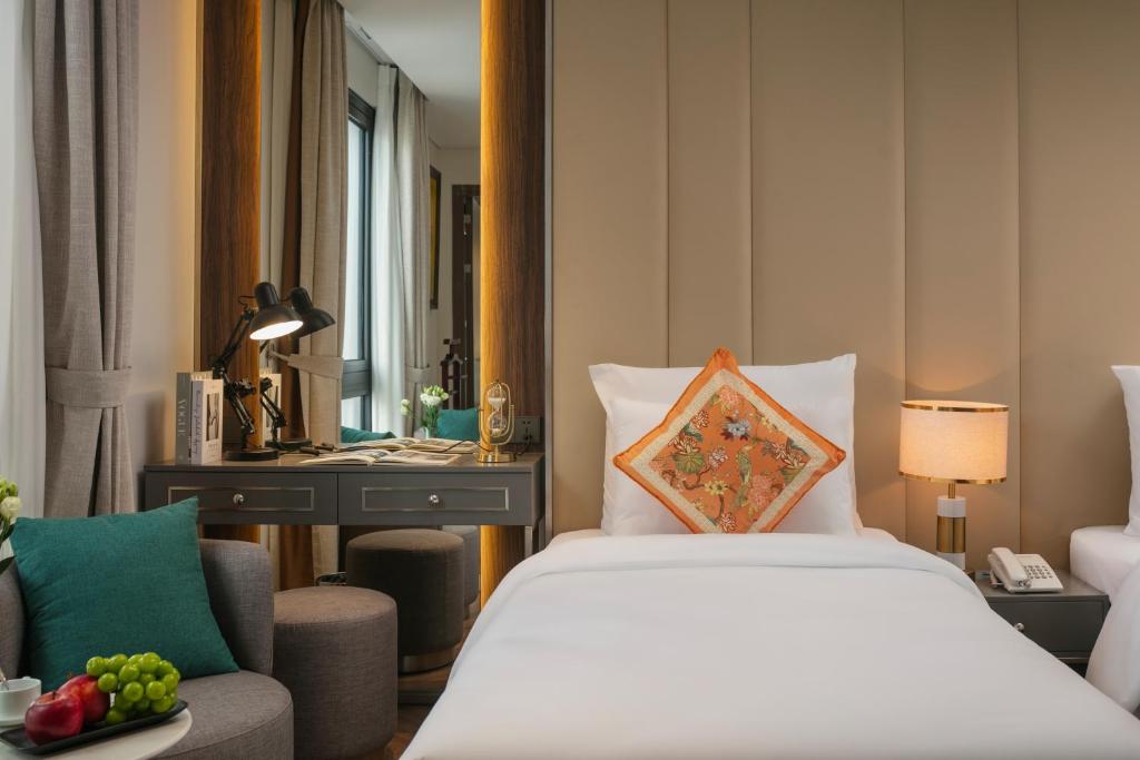 Tủ quần áo rộng lớn nuốt chửng hành lý, ấm đun nước chờ pha trà thảo mộc lúc nửa khuya. Một số phòng khoe ban công lộng gió, nơi bạn nhấp raclette tan chảy ngắm dòng người phố cổ nhảy múa; những căn khác mở cửa kính ôm trọn view thành phố lung linh – không phải cái nhìn mơ hồ, mà là cái vuốt ve từ những mái ngói cong soi bóng hồ Gươm. Ánh sáng dịu nhẹ từ đèn pha lê Geneva, rèm linen trắng muốt – thức dậy với tiếng chuông đồng hồ cổ, kéo rèm đón nắng heo may. Đây là nơi phòng không gây dị ứng khắc cốt ghi tâm, từ những buổi hít thở tinh khiết trên ghế ngồi đến giấc ngủ không vướng bận, thiên đường cho du khách hen suyễn hoặc kẻ sành điệu tìm bình yên.