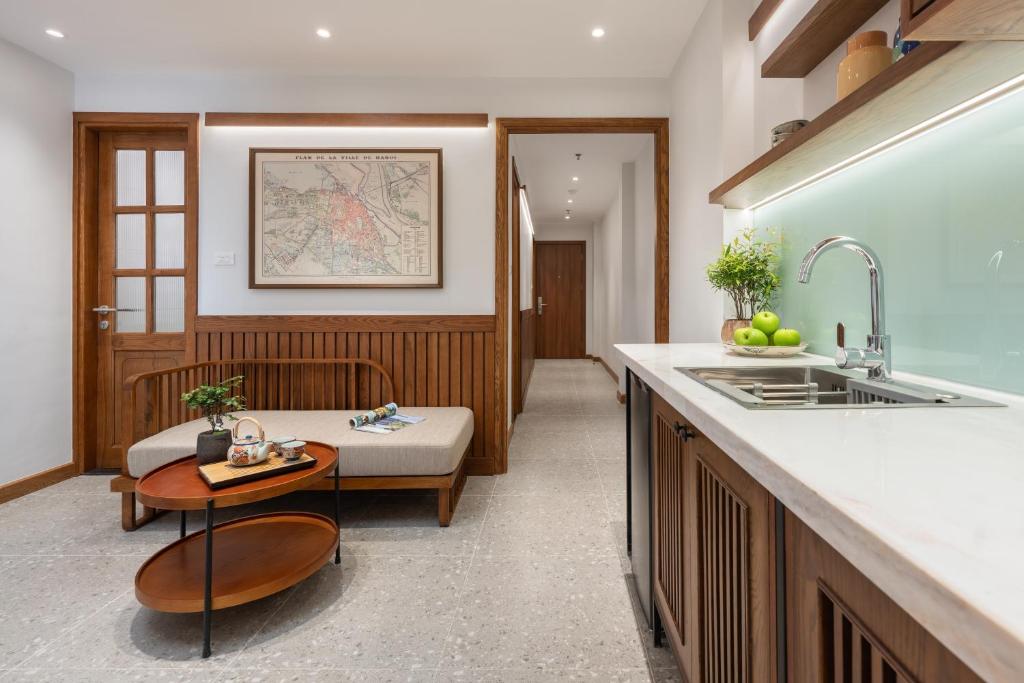 Bếp nhỏ là trái tim rực rỡ: tủ lạnh ầm ù ôm ấp phô mai camembert và rau thơm chợ Đồng Xuân, lò vi sóng quay vù biến bánh mì kẹp thịt thành tuyệt phẩm, bếp điện từ sôi sùng sục nấu pasta hải sản, ấm đun nước chờ pha cà phê sữa đá đậm đà. Ga trải giường mịn màng như satin Paris ôm ấp giấc ngủ ngọt ngào, khăn tắm ấm áp vuốt ve da thịt mỏi mòn. Ánh sáng dịu nhẹ từ đèn treo kiểu Pháp, sàn gỗ óc chó mát rượi – thức giấc với tiếng tàu hỏa xa xăm từ Ga Hà Nội, kéo rèm đón nắng mai lấp lánh. Đây là nơi căn hộ có bếp Hà Nội khắc sâu dấu ấn, từ những buổi nướng steak trên chảo gang đến giấc trưa nằm dài ghế ngồi ngắm phố, thiên đường cho cặp đôi hoặc gia đình khao khát độc lập.