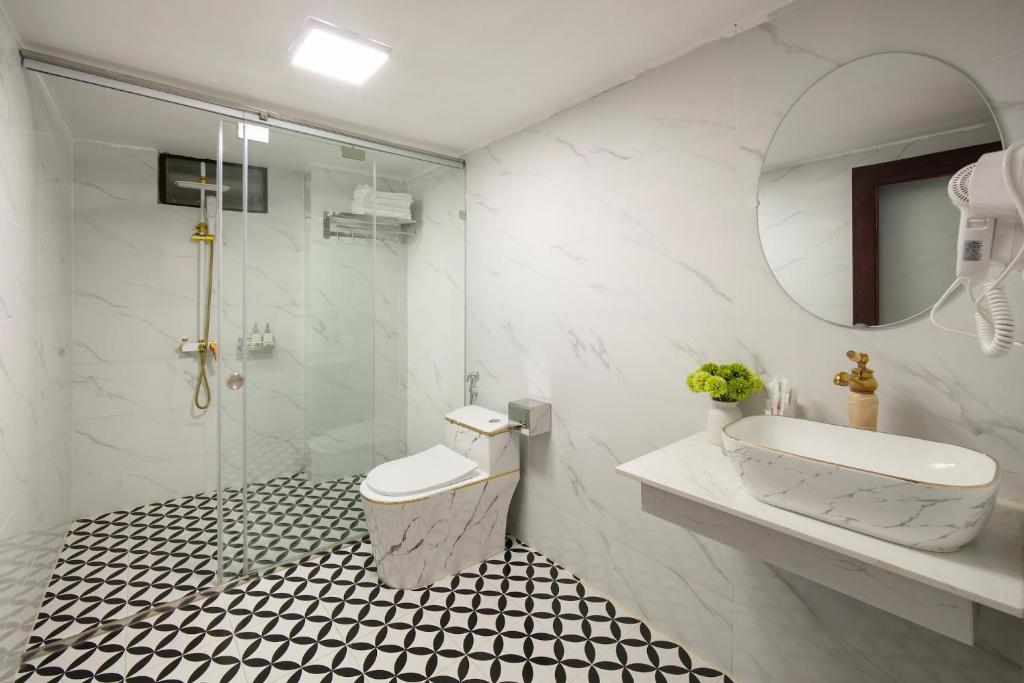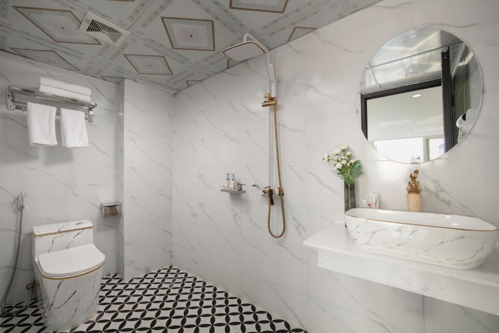 - Southgate Emperor Suite: bồn tắm đen bóng đặt giữa phòng, vòi sen mưa vàng đồng, view Văn Miếu – Nhà thờ Lớn