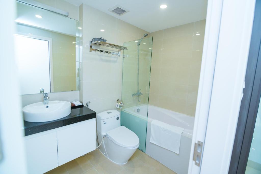 Phòng tắm riêng hiện đại được trang bị vòi xịt/chậu rửa vệ sinh, máy sấy tóc, đồ vệ sinh cá nhân miễn phí và dép đi trong phòng, giúp bạn trải nghiệm cảm giác tiện nghi như khách sạn 5 sao ngay tại căn hộ. Sự tinh tế trong từng chi tiết khiến HANA Stay trở thành lựa chọn lý tưởng cho những ai đề cao sự thoải mái và tiện nghi trong kỳ nghỉ.