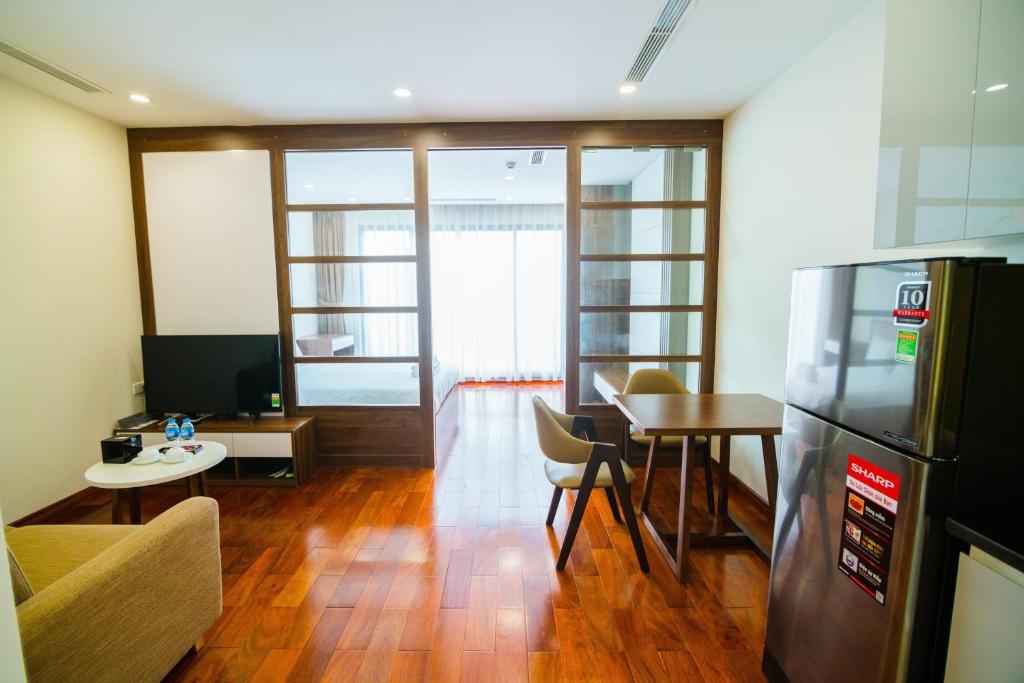 HANA Stay mang đến cho khách những căn hộ hiện đại với view toàn cảnh thành phố Hà Nội. Mỗi căn đều được thiết kế thông minh, tận dụng ánh sáng tự nhiên, tạo cảm giác rộng rãi và thoáng đãng. Khu vực ghế ngồi với giường sofa êm ái là nơi lý tưởng để bạn đọc sách, thư giãn hay đơn giản là ngắm nhìn nhịp sống nhộn nhịp bên ngoài. Không gian nội thất kết hợp hài hòa giữa phong cách hiện đại và tiện nghi đầy đủ, đem lại cảm giác như đang ở chính ngôi nhà thứ hai của bạn.