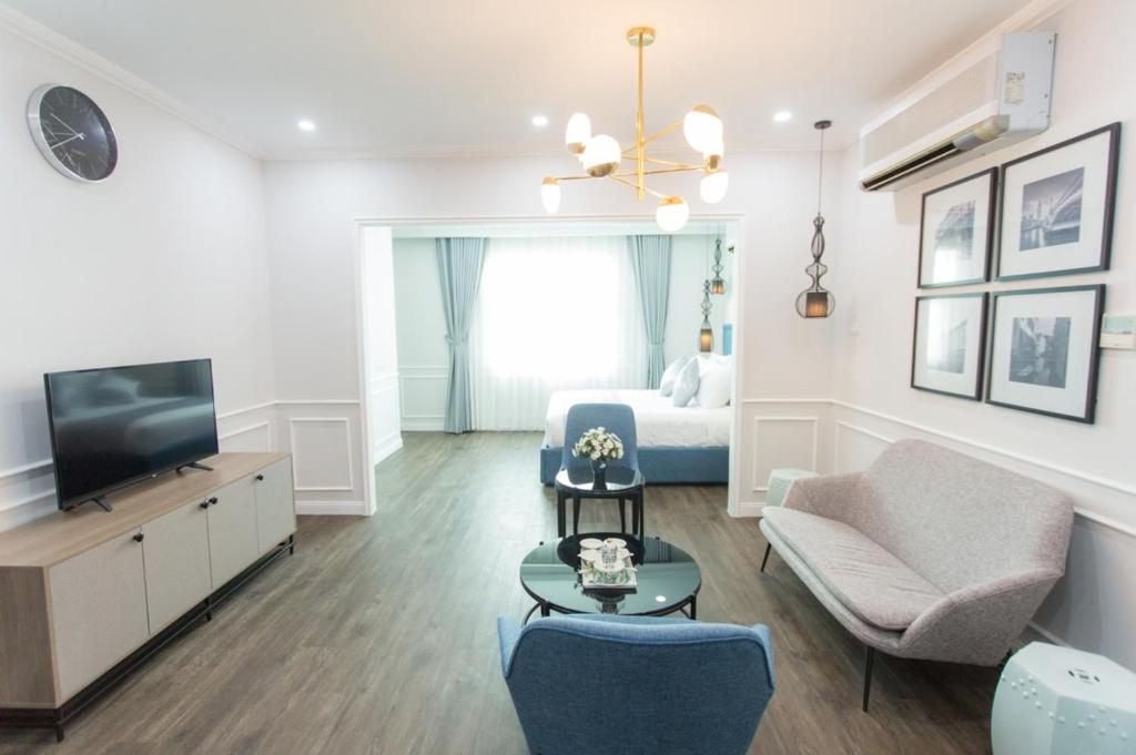 Khách sạn sở hữu các căn hộ rộng rãi được bài trí trang nhã, kết hợp hài hòa giữa thiết kế kiểu Pháp và Việt Nam. Mỗi căn hộ đều có phòng khách riêng biệt, ghế sofa thoải mái và TV truyền hình cáp màn hình phẳng. Bằng việc sử dụng tông màu be nhạt kết hợp một chút nâu, không gian tạo cảm giác ấm cúng, tinh tế nhưng vẫn giữ được sự sang trọng hiện đại.