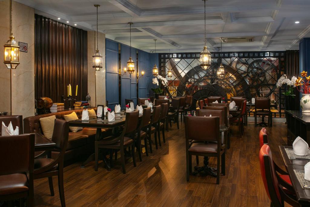 Phòng ốc thì đẹp đến mức muốn khóc. Giường king-size to đùng, nệm êm như ôm, chăn ga trắng muốt thơm mùi oải hương dịu nhẹ. TV 55 inch, két an toàn, minibar miễn phí nước + snack, tủ quần áo rộng rãi, dép lê êm ru. Một số phòng có ban công hoặc sân hiên riêng nhìn thẳng ra phố cổ – sáng ngồi đó uống cà phê phin, tối cầm ly vang đỏ ngắm đèn vàng vọt – không cần đi đâu xa cũng đủ thấy mình đang sống trong một bức tranh Hà Nội đẹp nhất.
