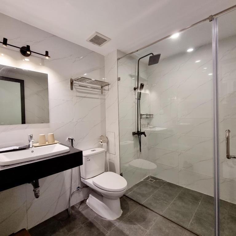 Phòng tắm riêng với vòi sen, máy sấy tóc và dép đi trong phòng, đảm bảo sự thoải mái tối đa cho khách.