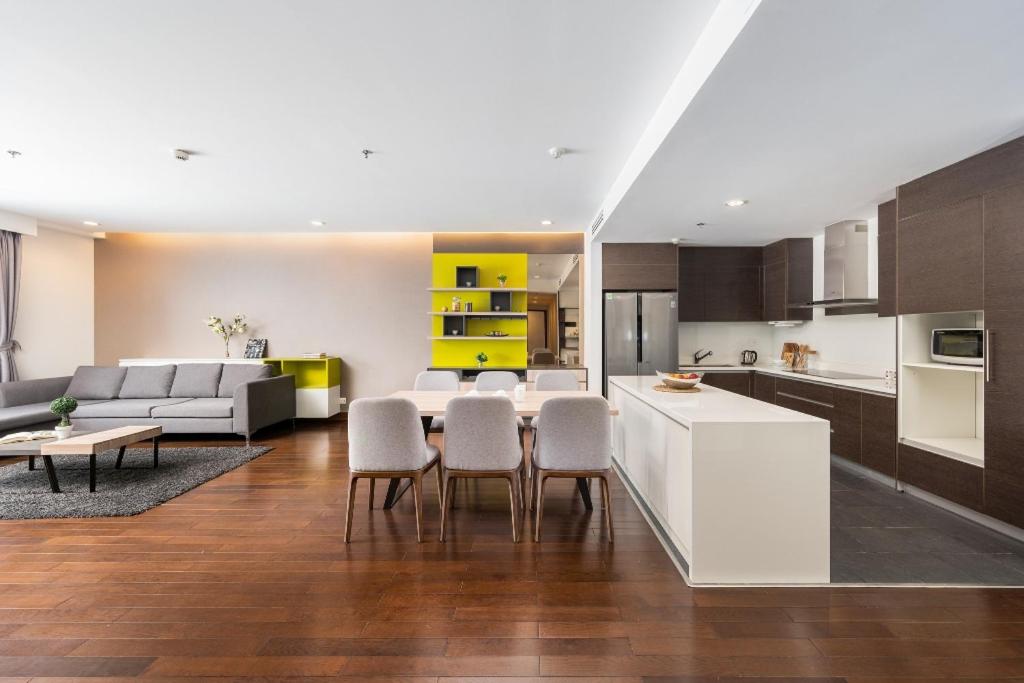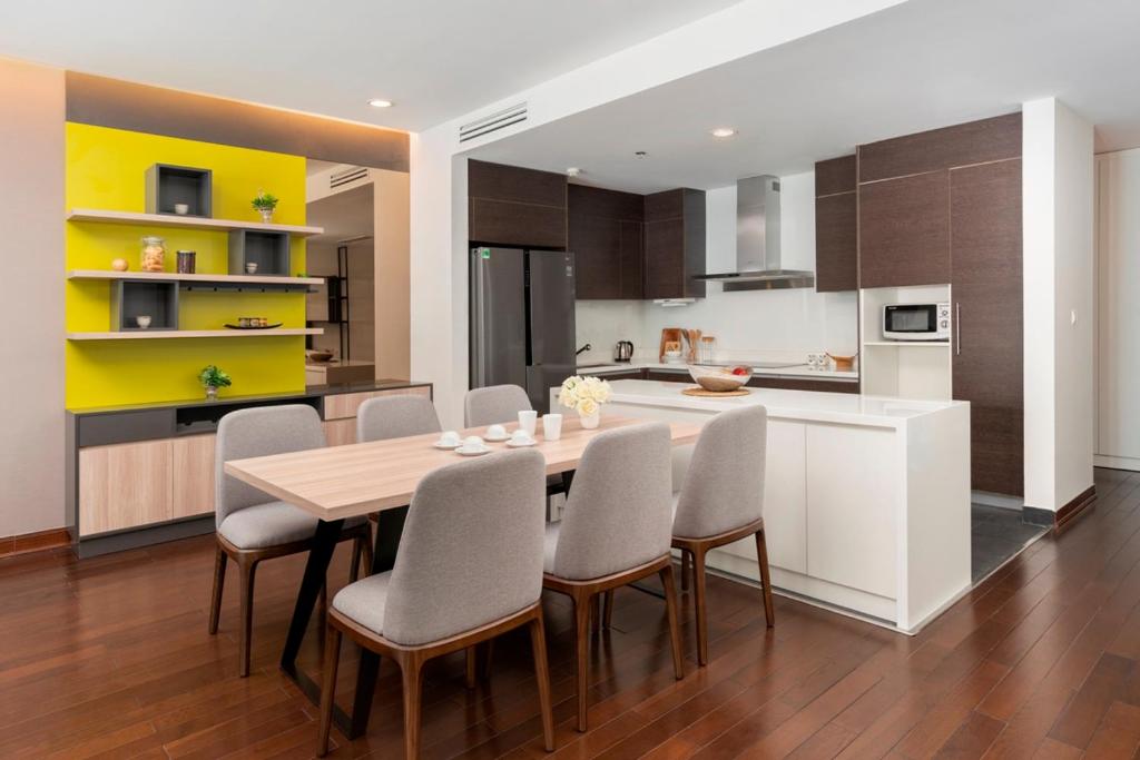 Không gian căn hộ được thiết kế hiện đại, mỗi phòng đều có máy điều hòa, phòng tắm riêng và khu bếp đầy đủ tiện nghi với lò vi sóng, tủ lạnh, bếp nấu cùng ấm đun nước. Đây là lựa chọn lý tưởng cho những ai muốn trải nghiệm sự tự do thoải mái như ở nhà nhưng vẫn tận hưởng dịch vụ cao cấp của một khách sạn 5 sao.
