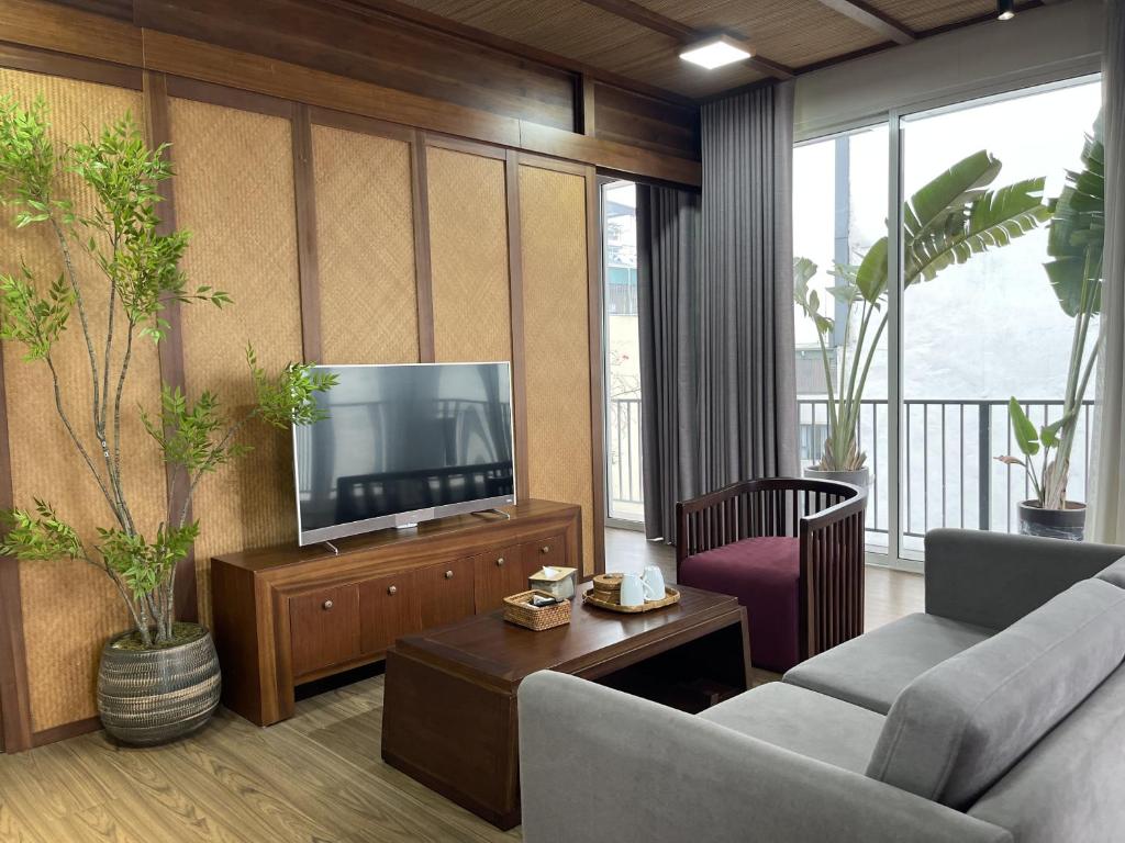 Phòng khách sáng sủa với khu vực ghế ngồi rộng rãi và TV màn hình phẳng, phù hợp để thư giãn sau một ngày dài.