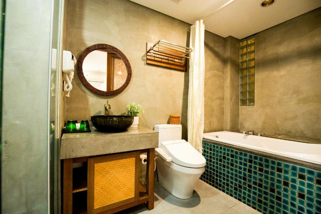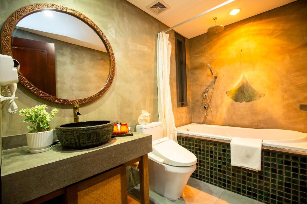 Phòng tắm riêng hiện đại có vòi sen, vòi xịt/chậu rửa vệ sinh, máy sấy tóc và đồ vệ sinh cá nhân miễn phí, mang lại sự tiện lợi tối đa.