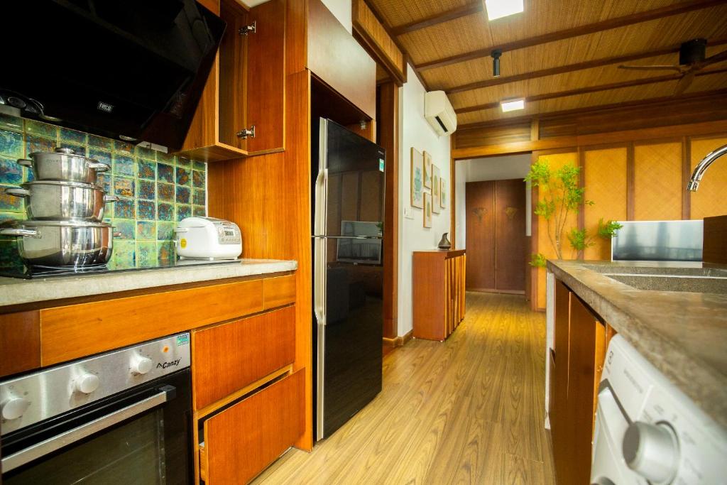 Khu vực bếp đầy đủ tiện nghi gồm tủ lạnh, lò vi sóng, minibar, ấm đun nước và dụng cụ nấu nướng – lý tưởng cho du khách thích tự chuẩn bị bữa ăn.