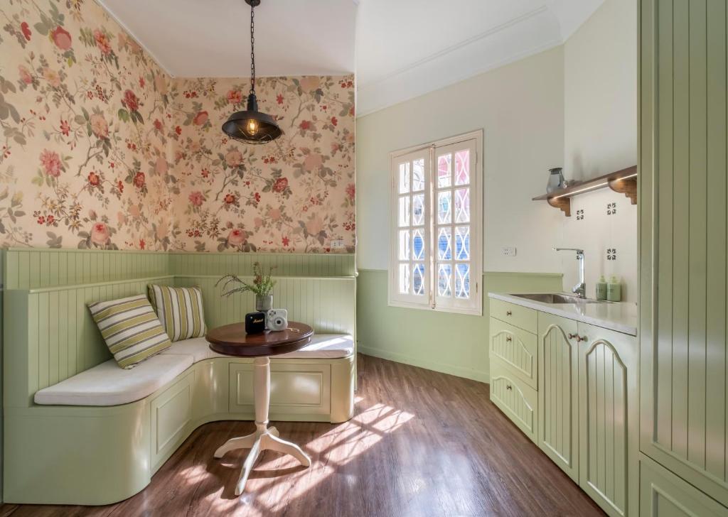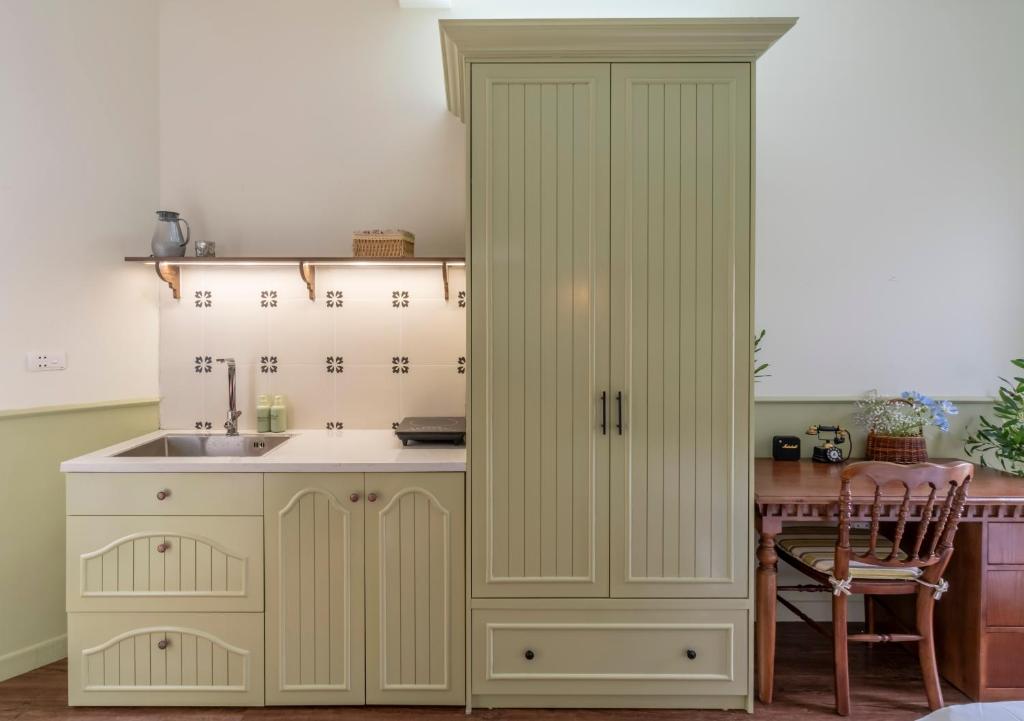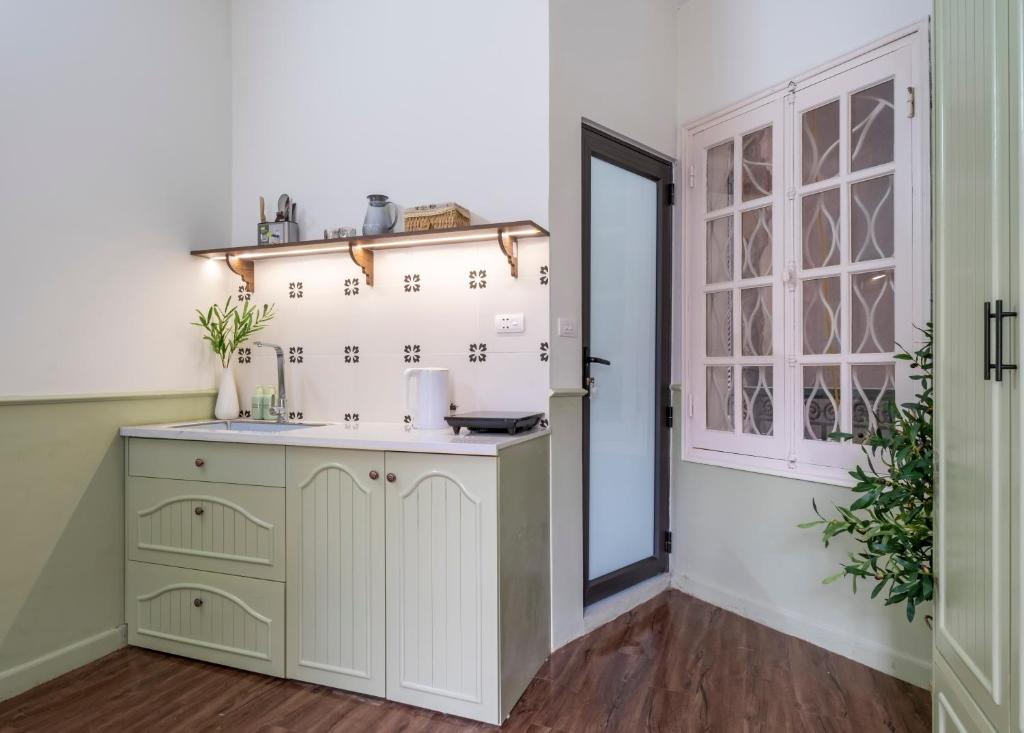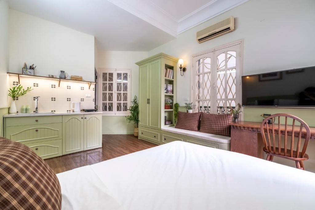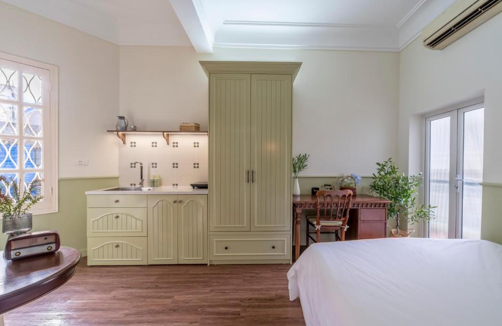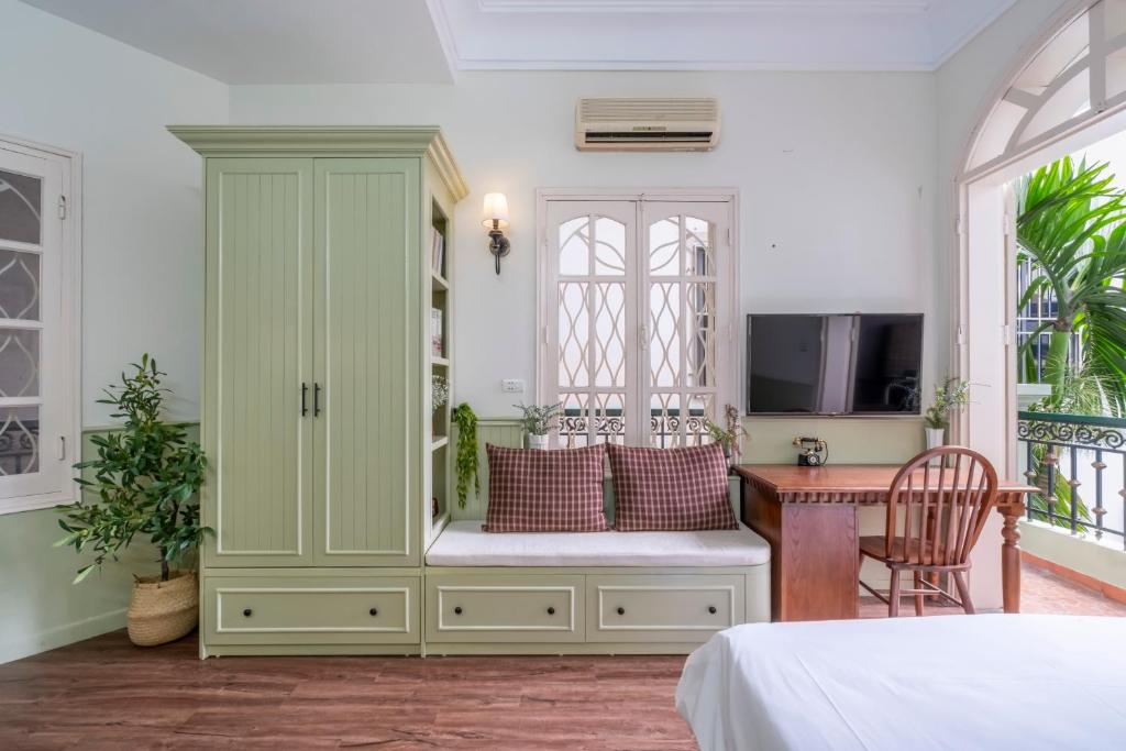 Căn hộ được trang bị điều hòa hiện đại, TV màn hình phẳng, và bếp nhỏ đầy đủ tiện nghi – nơi bạn có thể tự tay nấu bữa ăn ấm cúng giữa lòng Hà Nội. Tủ lạnh mini, ấm đun nước và không gian ăn uống nhỏ gọn mang lại sự tiện nghi mà vẫn giữ nguyên cảm giác thân thuộc.