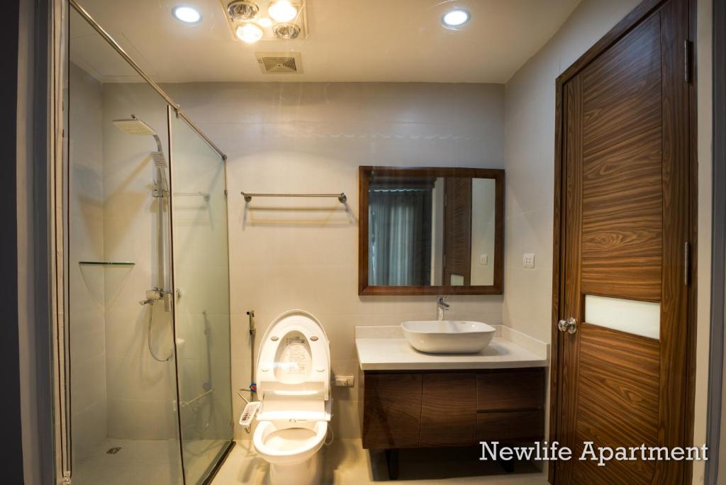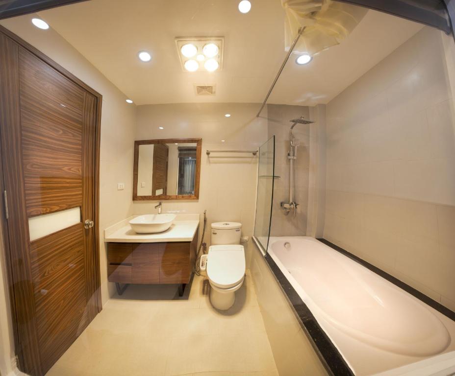 Phòng tắm cao cấp với vòi xịt/chậu rửa vệ sinh, gương lớn và nguồn nước nóng ổn định.