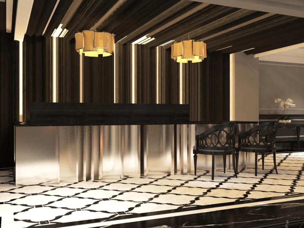- Quầy lễ tân bằng đá marble trắng Carrara, nhân viên mặc vest trắng + cà vạt vàng hoàng kim, đưa bạn một ly welcome champagne rosé thật và thì thầm: “Welcome to your palace, my lord & lady.”