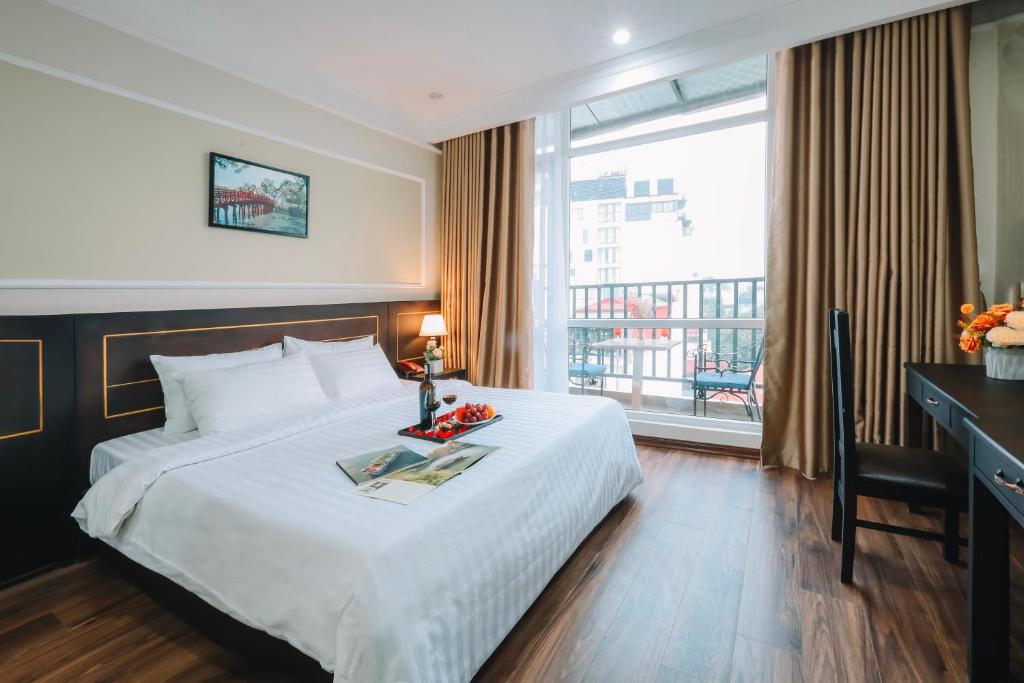 Ngõ Hàng Bông, khúc phố vàng son nhất 36 phường, chỉ cách Nhà hát Múa rối đúng 2 phút và hồ Gươm 700 m, có một toà nhà 14 tầng sơn đỏ gạch – vàng hoàng gia đứng im lặng như một cung điện Đông Dương vừa được đánh thức năm 2025. Biển đồng lớn khắc chữ Hanoi Hotel & Spa bằng font Art-Deco 1930, đèn chùm pha lê đỏ rực từ tầng 1 lên tận rooftop, cửa sổ vòm cong mở rộng như đang mời gọi. Dân Hà Nội thượng hạng gọi tắt là “H Đỏ”, vì đây chính là khách sạn “icon” nhất phố cổ: to lớn, hoành tráng, đỏ rực rỡ, và chỉ cần đứng chụp một tấm ảnh trước cửa là Instagram nổ tung.