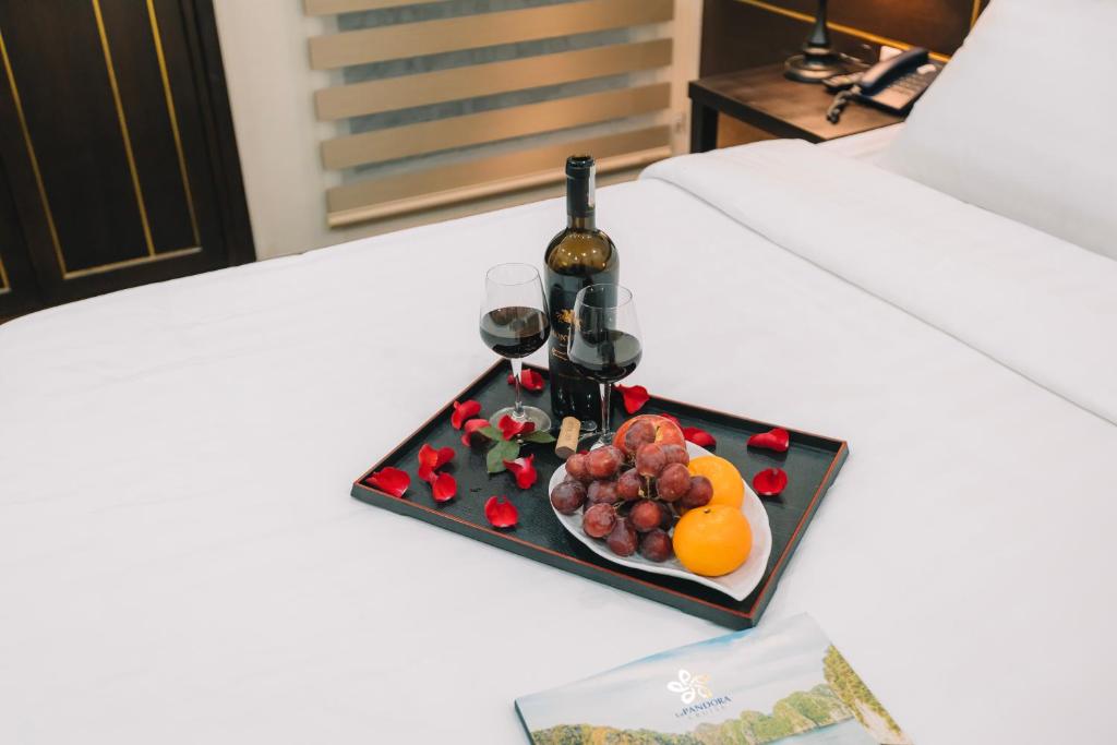 - Minibar miễn phí 100%: champagne Dom mini, rượu vang đỏ Đà Lạt Premium, bánh cốm đỏ gói lá sen