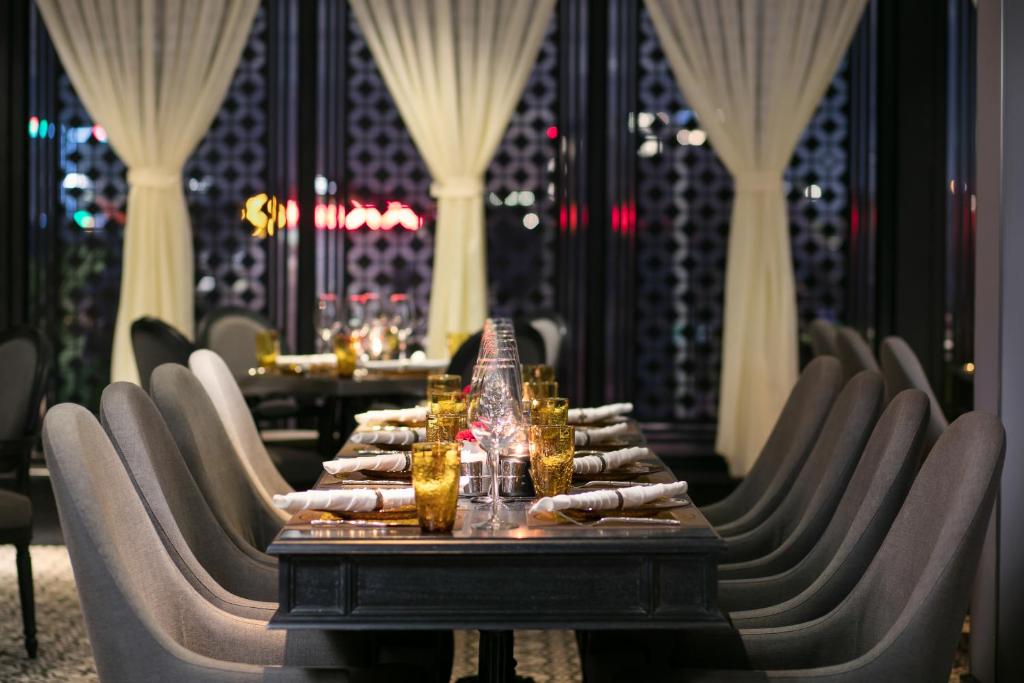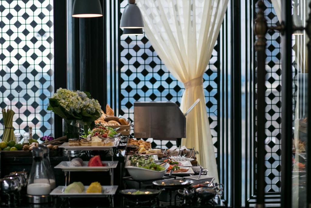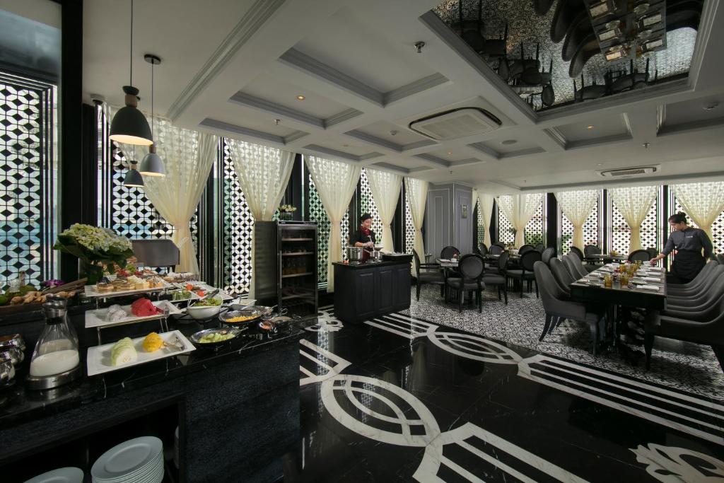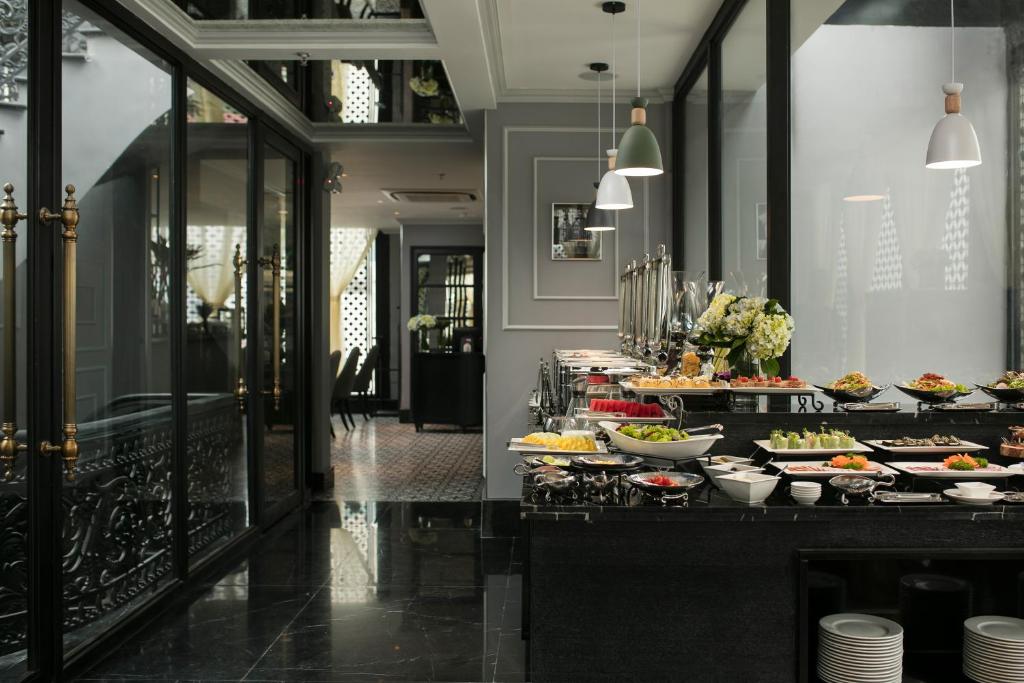 Buffet sáng ở tầng 2 là một buổi hoà nhạc thực thụ: góc Việt có phở bò Kobe tái lăn, bánh cuốn nhân thịt nướng than, cháo trai, bún ốc cô Đường; góc Tây có croissant nóng giòn, trứng benedict sốt hollandaise chảy lòng đào, thịt nguội Parma 18 tháng, phô mai Brie tan chảy. Cà phê pha phin hoặc espresso tuỳ thích, nước ép cần tây – cà rốt – táo ép chậm tại chỗ. Chủ nhật còn có góc champagne brunch miễn phí flow từ 11h–14h.