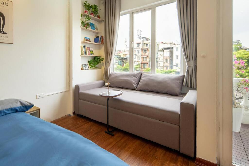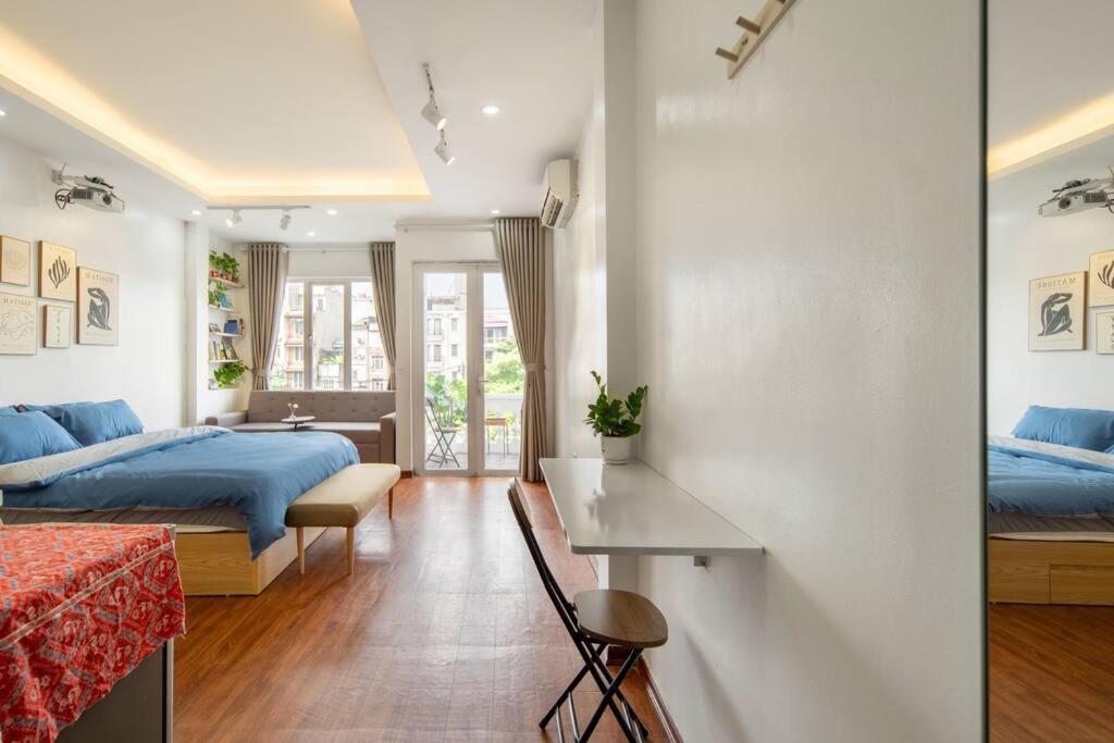 Nhưng ngôi sao sáng nhất chính là cái ban công “bliss” thật sự. To. Rộng. Đẹp. Nhìn thẳng ra thành phố: mái ngói nâu trầm, Ô Quan Chưởng cổ kính, xa xa là Nhà hát Lớn và một góc Hồ Gươm lấp lánh. Sáng sớm ngồi đây uống cà phê phin, nhìn cô bán bánh mì đi qua, mấy chú chim sẻ nhảy nhót trên mái – bình yên đến lạ. Chiều về mở lon bia Hà Nội lạnh, bật loa nghe Trịnh, gió từ hồ thổi lên mát rượi. Tối thì biến thành sân khấu sống ảo: đèn vàng, ghế mây, background là phố cổ lên đèn – chụp một tấm là cả thế giới phải hỏi “ơ ở đâu đẹp thế”.