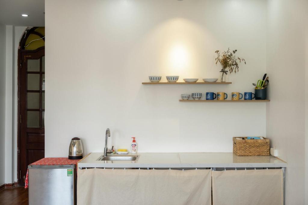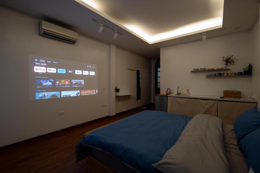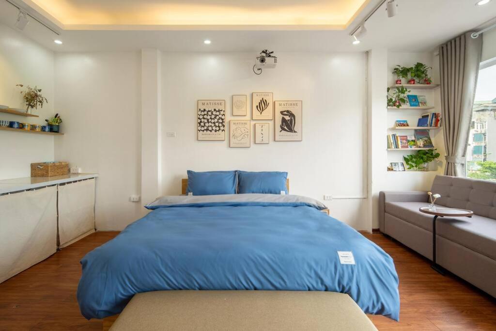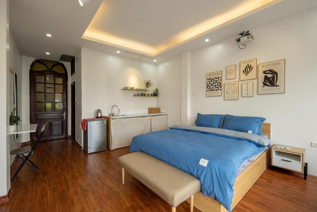 Mở cửa bước vào – trời ơi xinh! Căn hộ nguyên căn 1 phòng ngủ thực sự, giường king-size to đùng, nệm êm như ôm, chăn ga trắng muốt thơm mùi nắng. Điều hòa mát lạnh, wifi mạnh tới mức livestream từ ban công mà không giật. Bếp đầy đủ tiện nghi: bếp từ, tủ lạnh, lò vi sóng, nồi xoong chảo sạch bong, dao thớt sắc lẹm – đi chợ Đồng Xuân mua ít thịt bò, ít rau về xào tối là có ngay bữa cơm nhà giữa lòng Hà Nội.