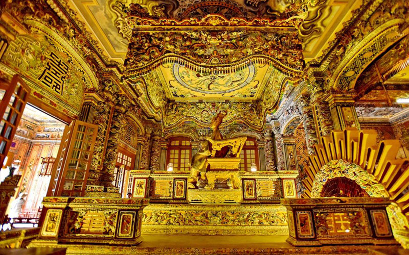Ngày đầu, máy bay đưa bạn thẳng đến Huế. Xe lăn bánh qua đường xuân xanh mướt, dừng chân Lăng Khải Định – kiệt tác Đông Tây với những bức tường sành sứ lấp lánh nắng. Ghé Làng Hương Thủy Xuân – những bó hương multicolored xếp tầng tầng lớp lớp, mùi trầm quyện gió. Chiều vào Đại Nội với Ngọ Môn uy nghi, Điện Thái Hòa trầm mặc, Tử Cấm Thành bí ẩn. Kết thúc bằng Chùa Thiên Mụ cổ kính bên sông Hương. Nghỉ đêm Huế. Gợi ý: Tự túc nghe ca Huế trên thuyền rồng buổi tối – tiếng hát da diết sẽ khiến lòng bạn rung động.